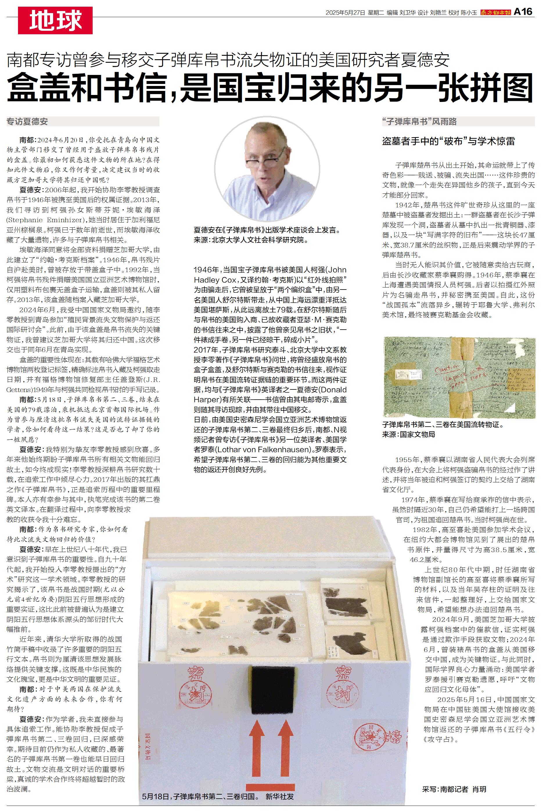 日前,由美国史密森尼学会国立亚洲艺术博物馆返还的子弹库帛书第二、三卷最终归乡后,南都、N视频记者曾专访《子弹库帛书》另一位英译者、美国学者罗泰(Lothar von Falkenhausen)。
