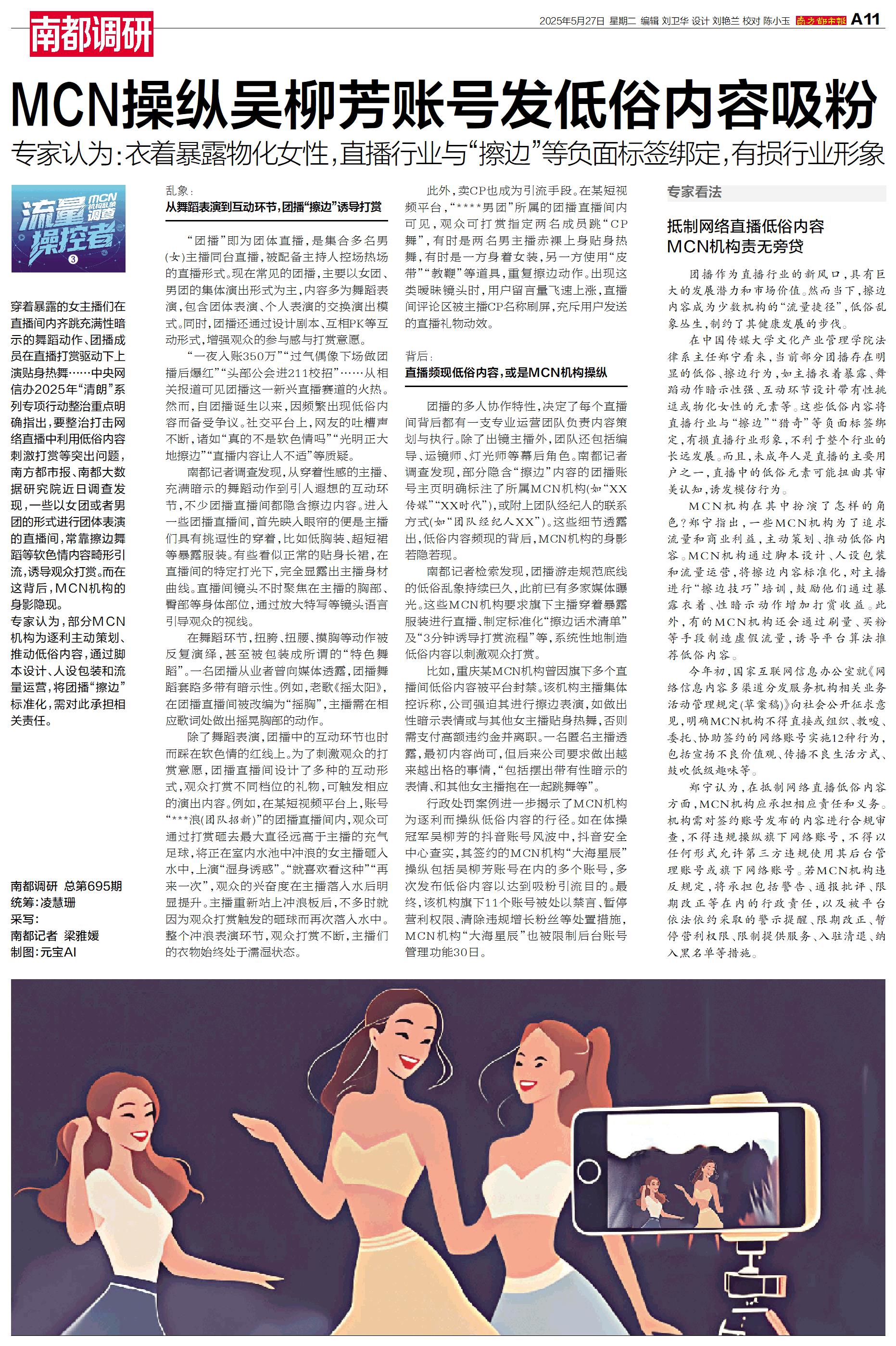 南方都市报、南都大数据研究院近日调查发现,一些以女团或者男团的形式进行团体表演的直播间,常靠擦边舞蹈等软色情内容畸形引流,诱导观众打赏。