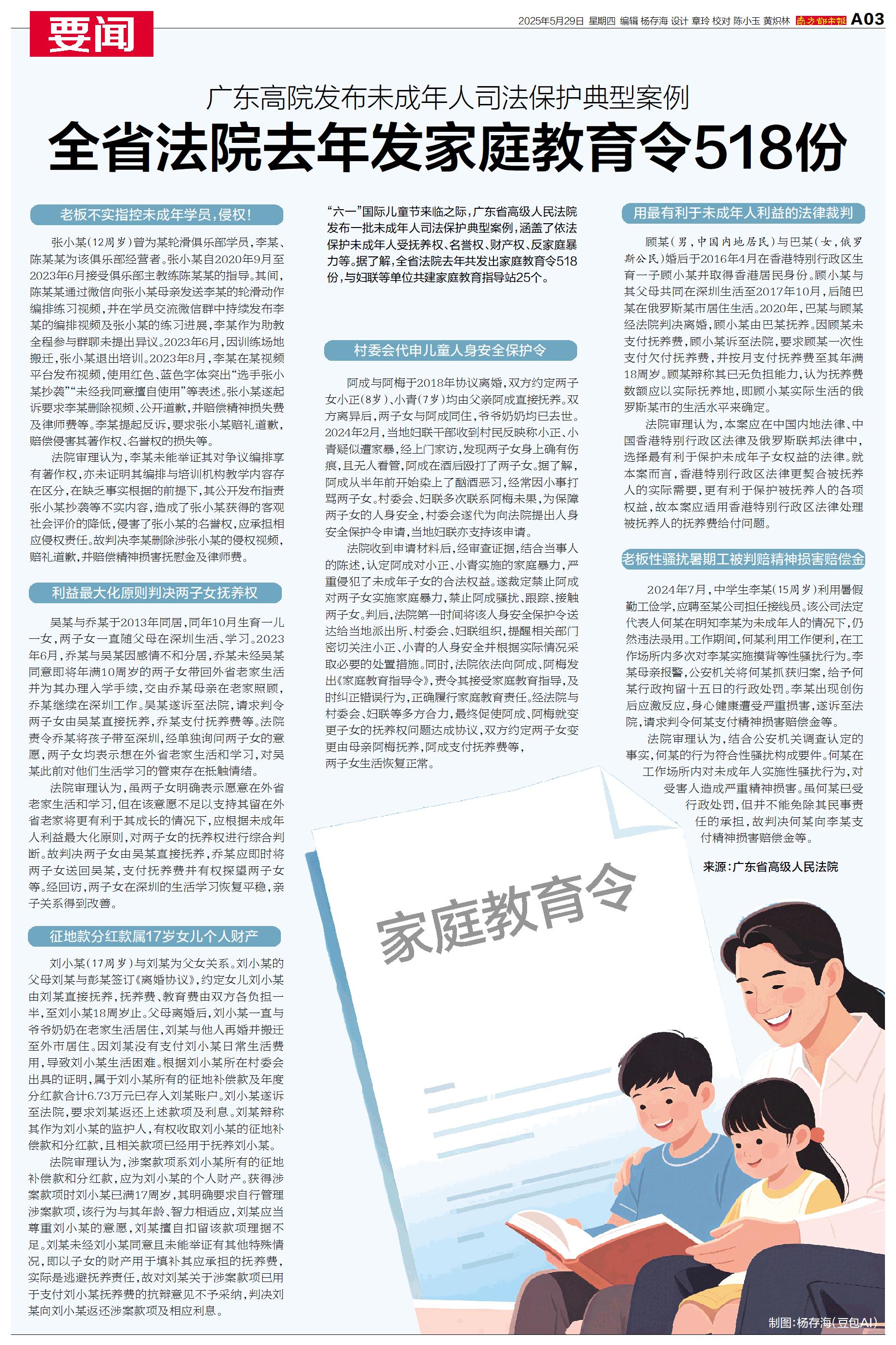 “六一”国际儿童节来临之际,广东省高级人民法院发布一批未成年人司法保护典型案例,涵盖了依法保护未成年人受抚养权、名誉权、财产权、反家庭暴力等。据了解,全省法院去年共发出家庭教育令518份,与妇联等单位共建家庭教育指导站25个。