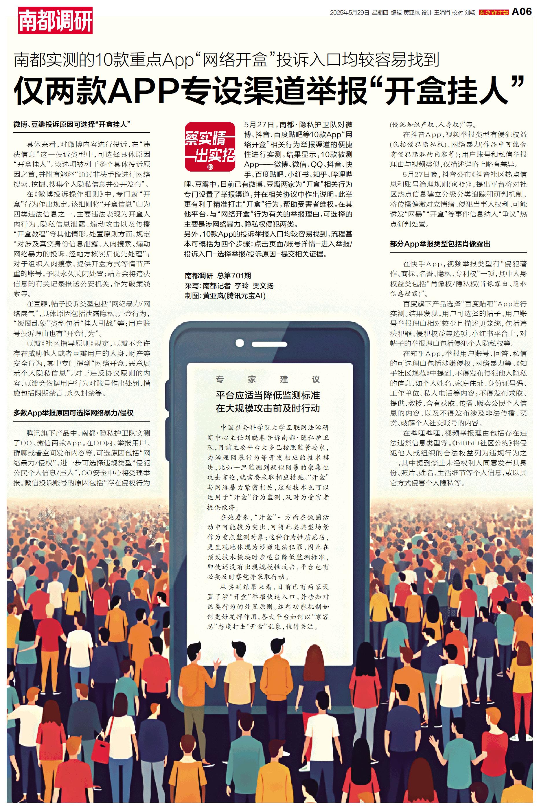 5月27日,南都·隐私护卫队对微博、抖音、百度贴吧等10款App“网络开盒”相关行为举报渠道的便捷性进行实测。