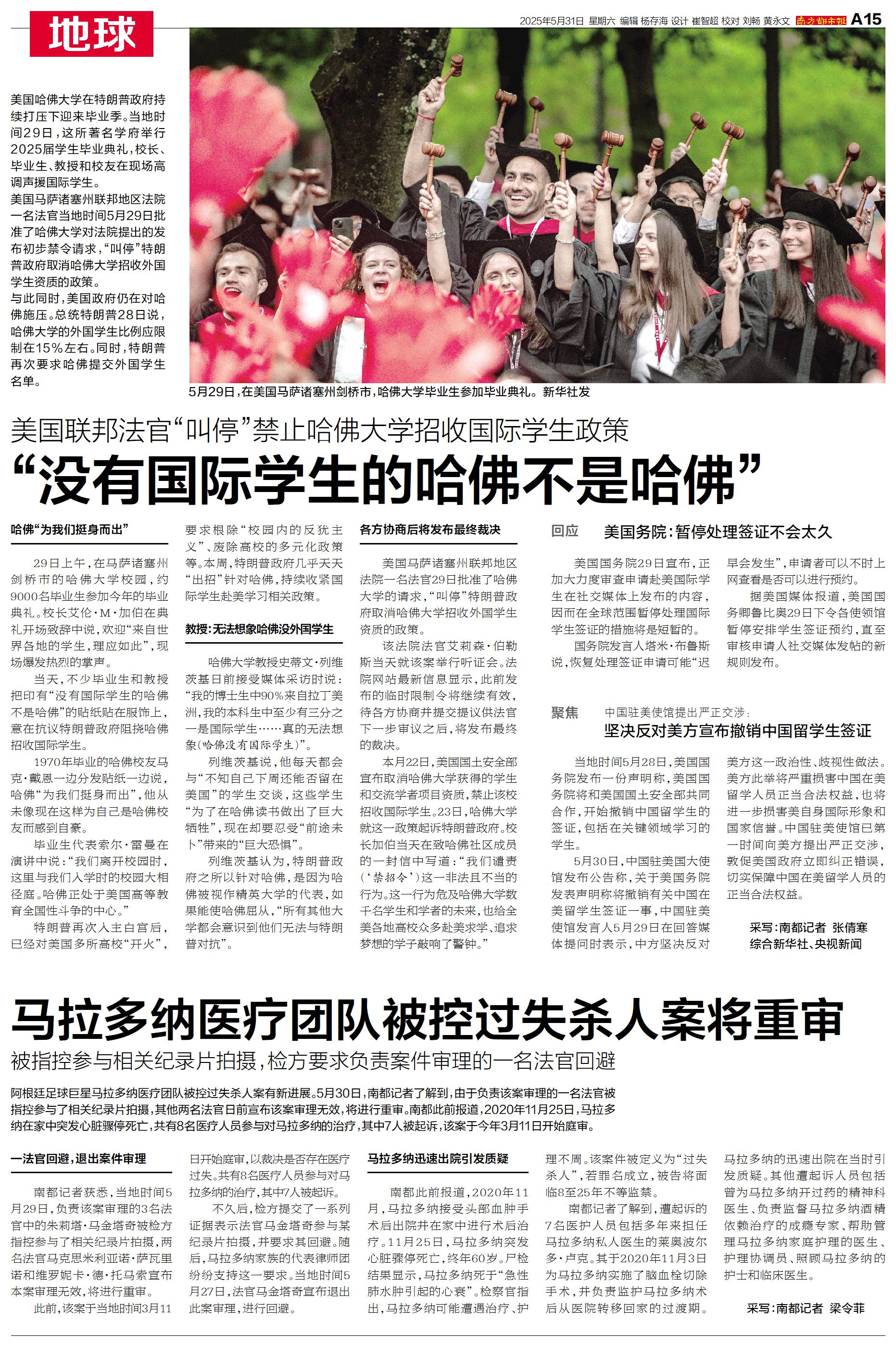 本月22日,美国国土安全部宣布取消哈佛大学获得的学生和交流学者项目资质,禁止该校招收国际学生。23日,哈佛大学就这一政策起诉特朗普政府。校长加伯当天在致哈佛社区成员的一封信中写道:“我们谴责(‘禁招令’)这一非法且不当的行为。这一行为危及哈佛大学数千名学生和学者的未来,也给全美各地高校众多赴美求学、追求梦想的学子敲响了警钟。”