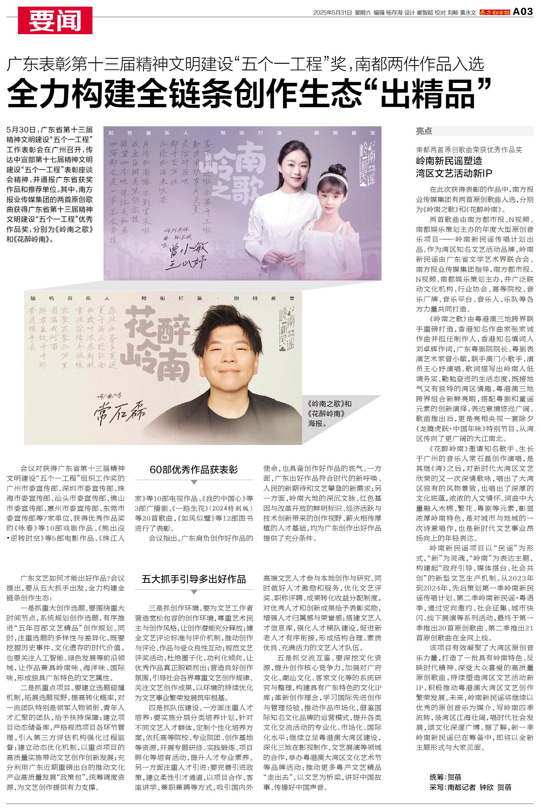 5月30日,广东省第十三届精神文明建设“五个一工程”工作表彰会在广州召开,传达中宣部第十七届精神文明建设“五个一工程”表彰座谈会精神,并通报广东省获奖作品和推荐单位。