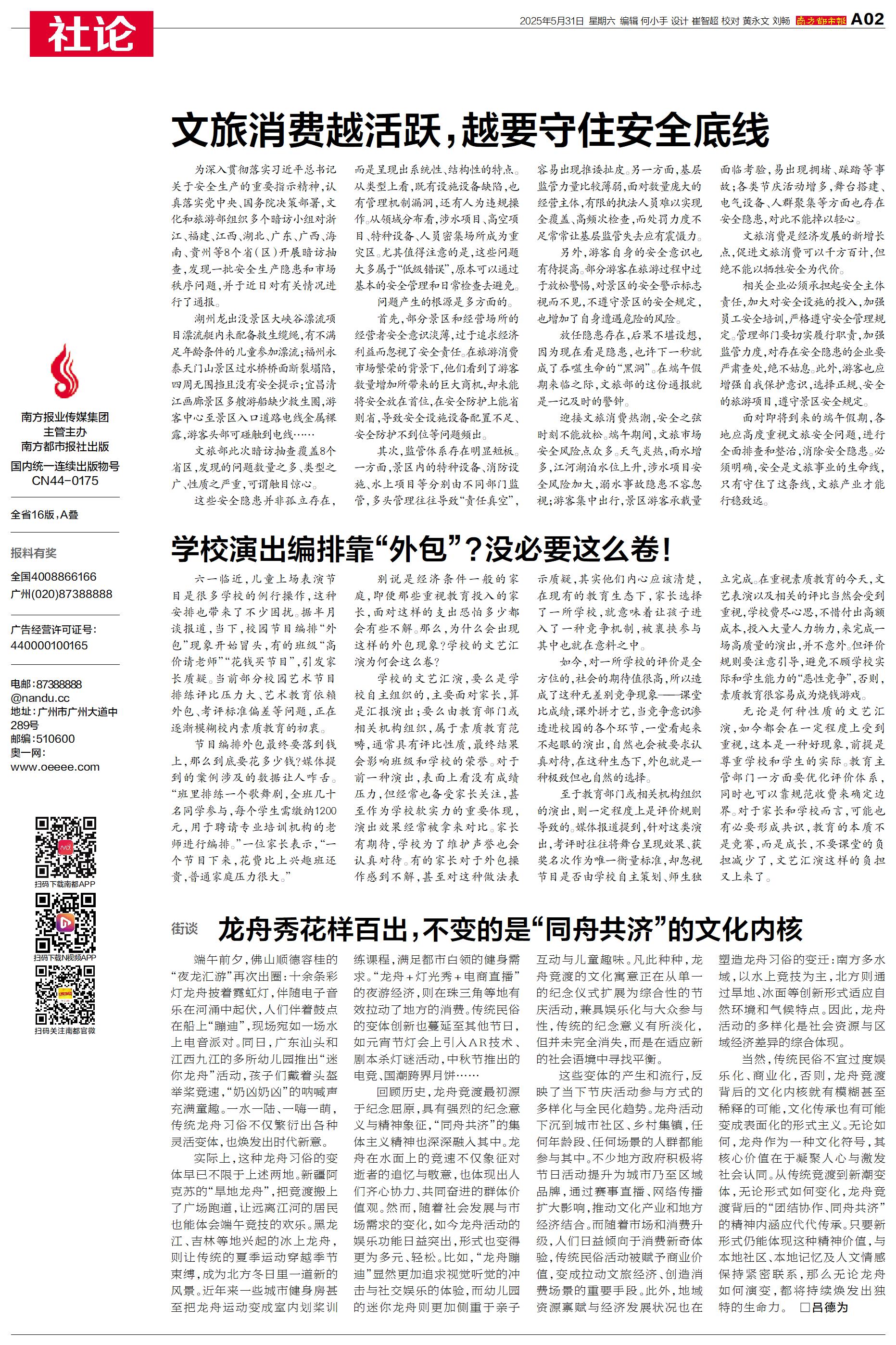 面对即将到来的端午假期,各地应高度重视文旅安全问题,进行全面排查和整治,消除安全隐患。必须明确,安全是文旅事业的生命线,只有守住了这条线,文旅产业才能行稳致远。