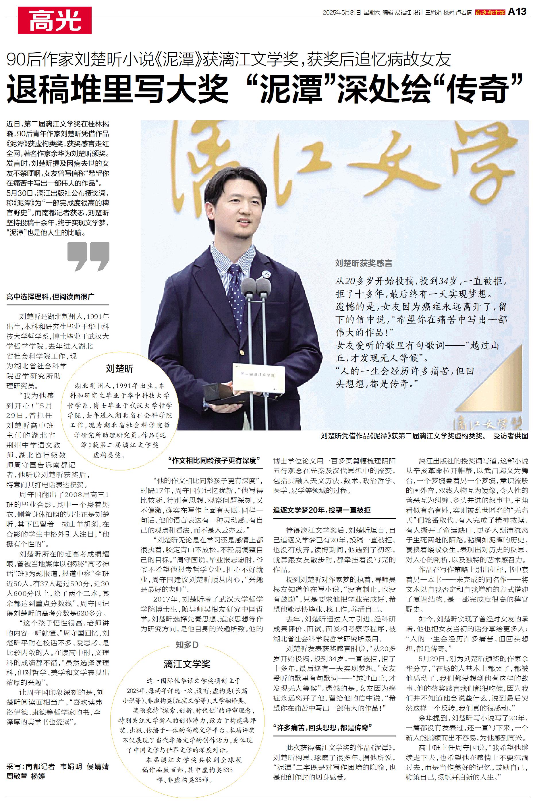 近日,第二届漓江文学奖在桂林揭晓,90后青年作家刘楚昕凭借作品《泥潭》获虚构类奖,获奖感言走红全网,著名作家余华为刘楚昕颁奖。