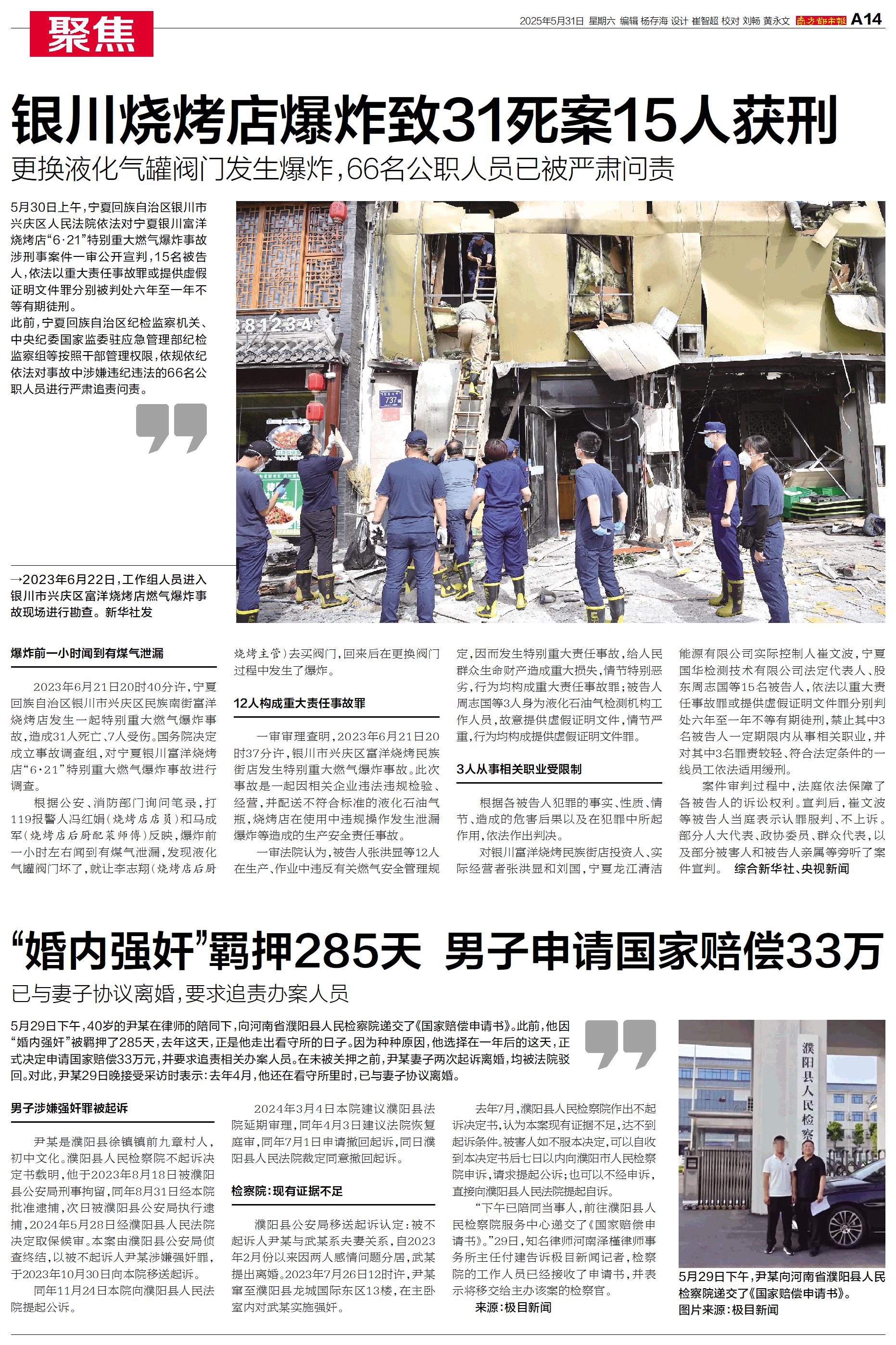 5月30日上午,宁夏回族自治区银川市兴庆区人民法院依法对宁夏银川富洋烧烤店“6·21”特别重大燃气爆炸事故涉刑事案件一审公开宣判,15名被告人,依法以重大责任事故罪或提供虚假证明文件罪分别被判处六年至