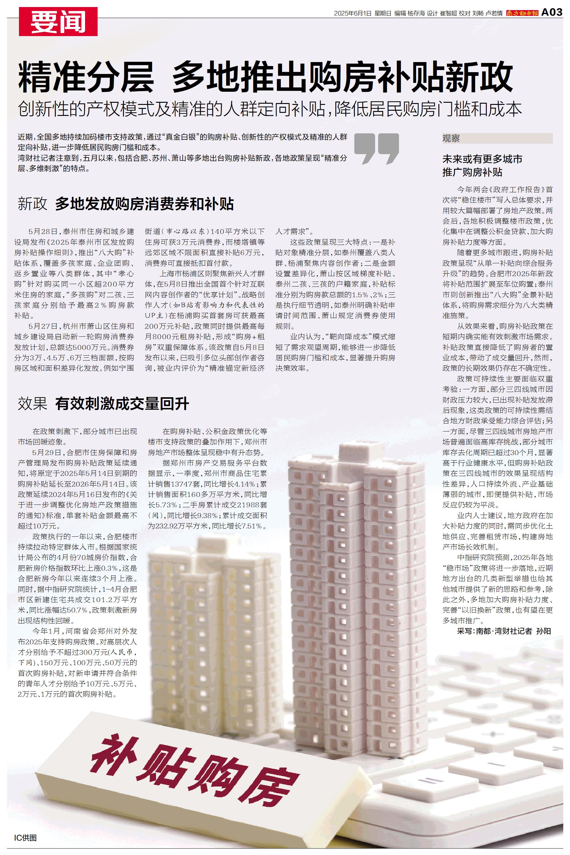 湾财社记者注意到,五月以来,包括合肥、苏州、萧山等多地出台购房补贴新政,各地政策呈现“精准分层、多维刺激”的特点。