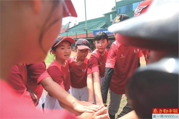 垒球天河区队队员们赛前鼓劲。