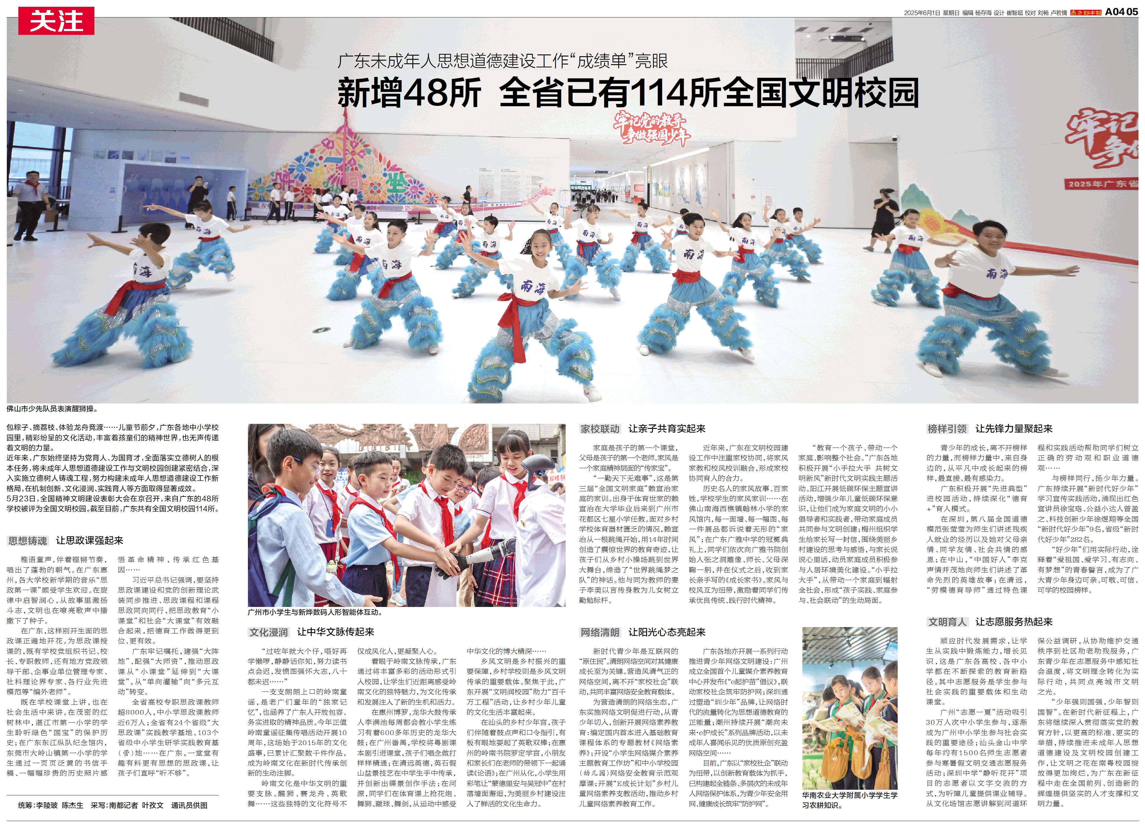 儿童节前夕,广东各地中小学校园里,精彩纷呈的文化活动,丰富着孩童们的精神世界,也无声传递着文明的力量。
