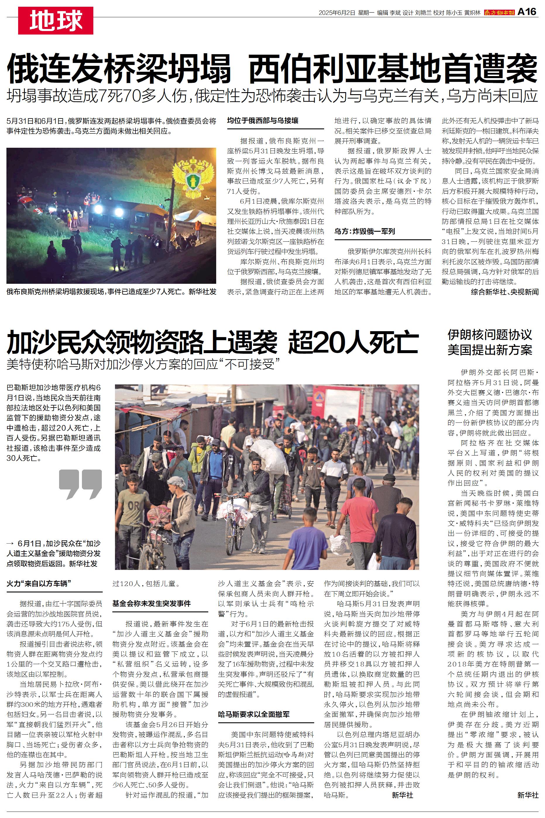 巴勒斯坦加沙地带医疗机构6月1日说,当地民众当天前往南部拉法地区处于以色列和美国监管下的援助物资分发点,途中遭枪击,超过20人死亡,上百人受伤。
