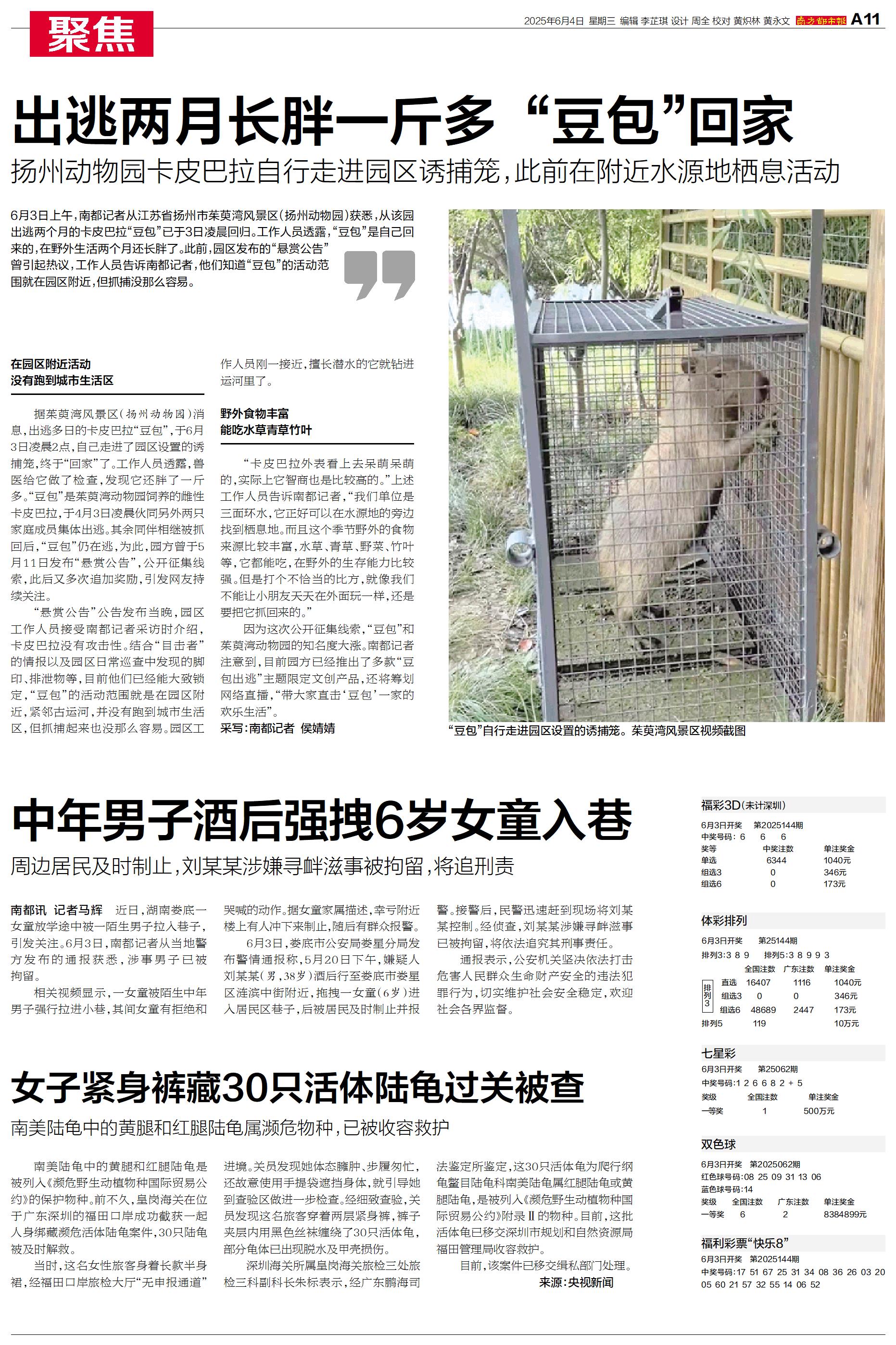 6月3日上午,南都记者从江苏省扬州市茱萸湾风景区(扬州动物园)获悉,从该园出逃两个月的卡皮巴拉“豆包”已于3日凌晨回归。