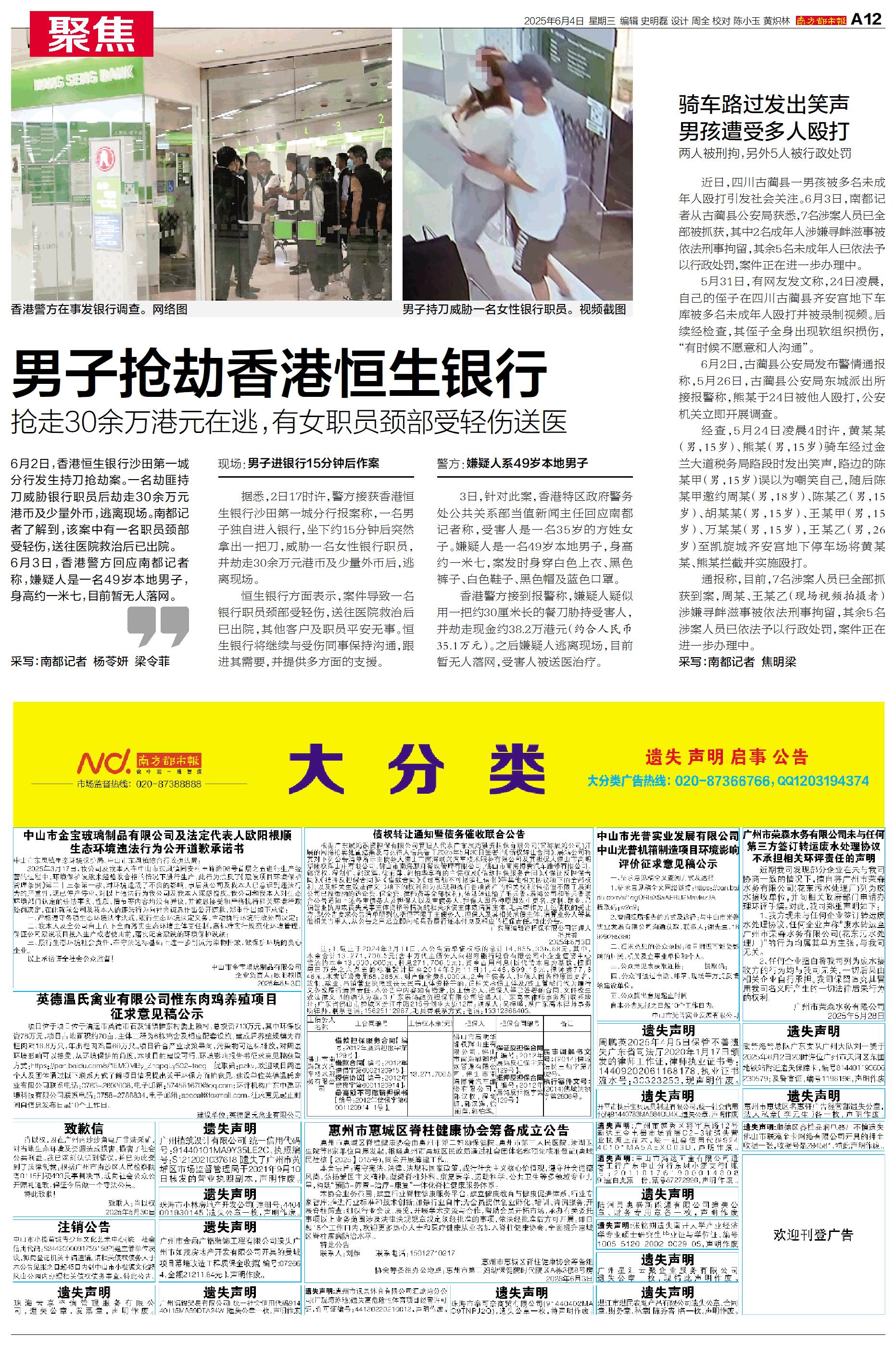 6月2日,香港恒生银行沙田第一城分行发生持刀抢劫案。