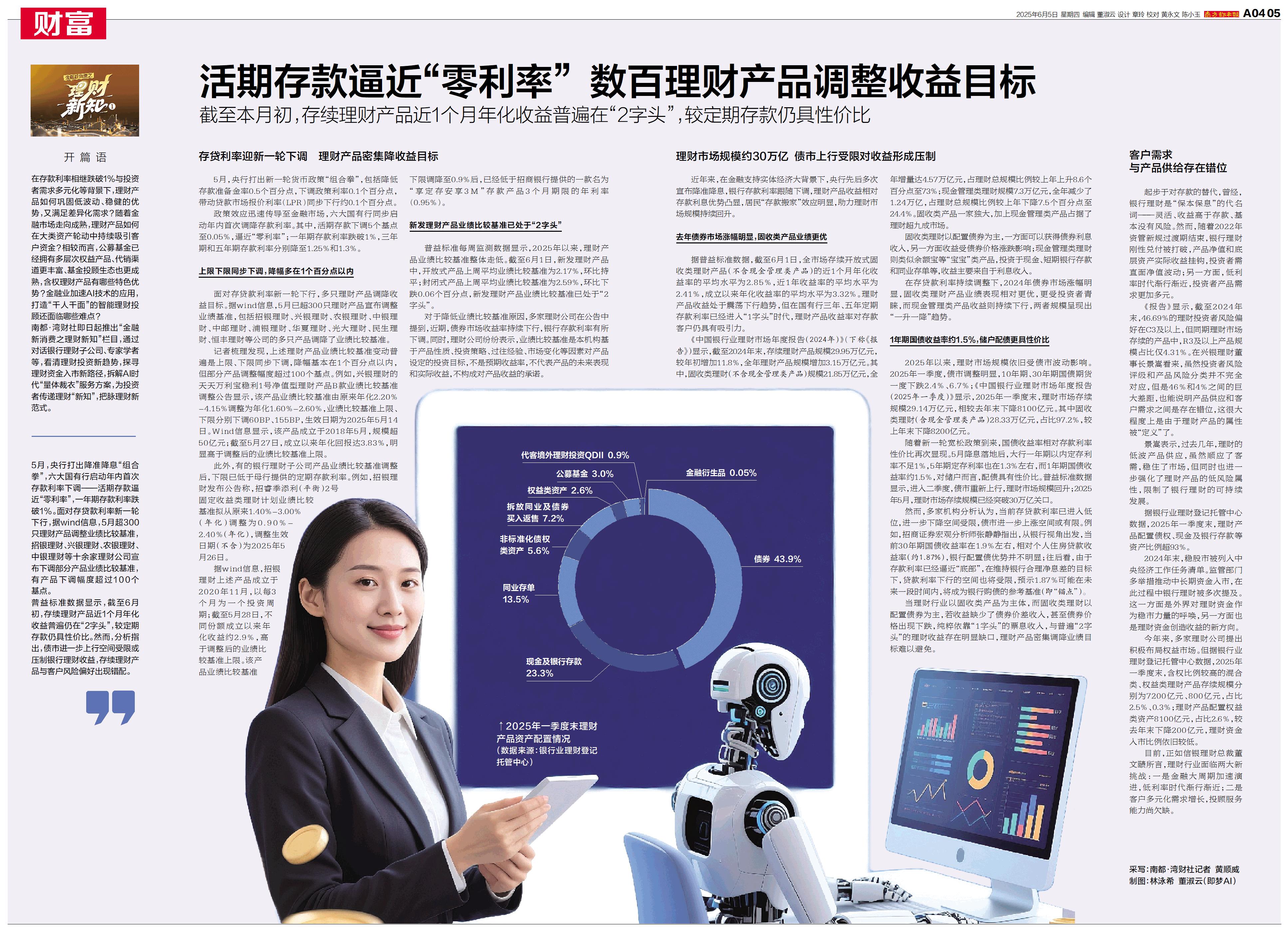 据银行业理财登记托管中心数据,2025年一季度末,理财产品配置债权、现金及银行存款等资产比例超93%。