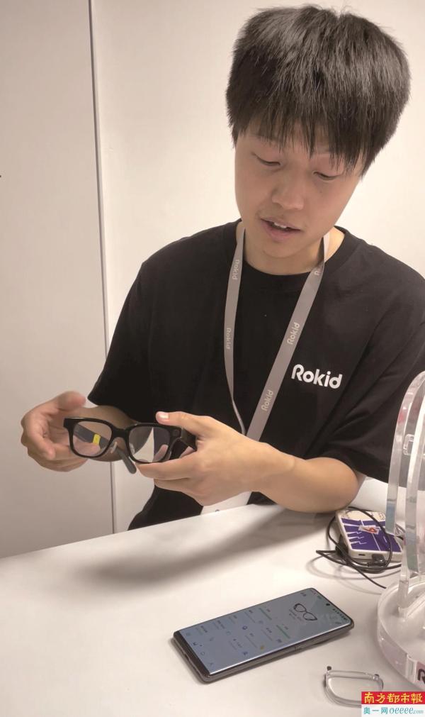 Rokid工作人员展示AI眼镜新品与相关APP。