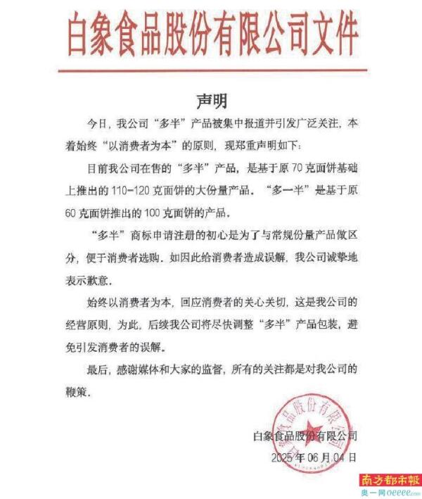 针对多半袋面“多半”是商标的相关争议,白象食品发布致歉声明回应称,“多半”产品,是基于原70克面饼基础上推出的110-120克面饼的大分量产品。声明指出,“多一半”是基于原60克面饼推出的100克面饼的产品。“多半”商标申请注册的初心是为了与常规分量产品做区分,便于消费者选购。如因此给消费者造成误解,公司诚挚地表示歉意。后续公司将尽快调整“多半”产品包装,避免引发消费者的误解。