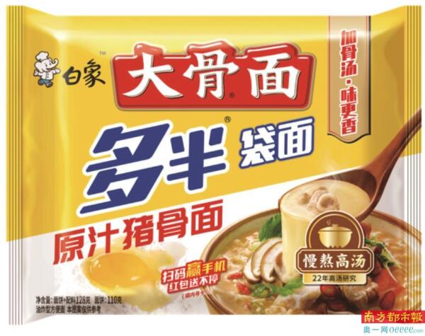 南都记者留意到,目前,白象的“多半”方便面产品在各大电商平台仍然有售。以“多半”牌袋装红烧牛肉面为例,其面饼为110克。而常规的白象袋装红烧牛肉面,其面饼为75克,“多半”品牌的面饼含量比常规品牌面饼含量高近50%。而白象旗舰店产品详情界面显示,“多一半”品牌的袋装红烧牛肉面,面饼重量为100克,比白象60克系列产品多几十克。