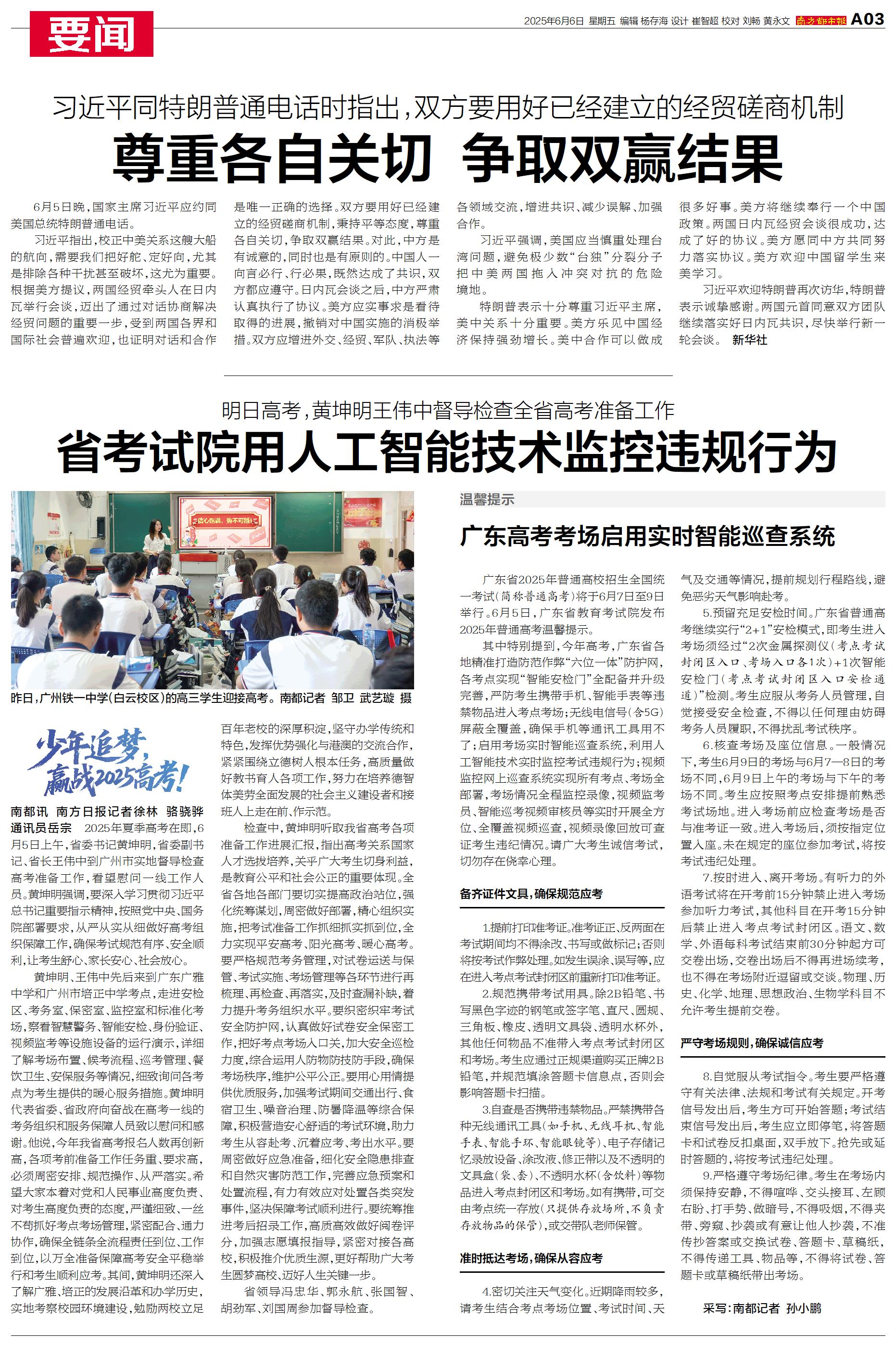 2025年夏季高考在即,6月5日上午,省委书记黄坤明,省委副书记、省长王伟中到广州市实地督导检查高考准备工作,看望慰问一线工作人员。
