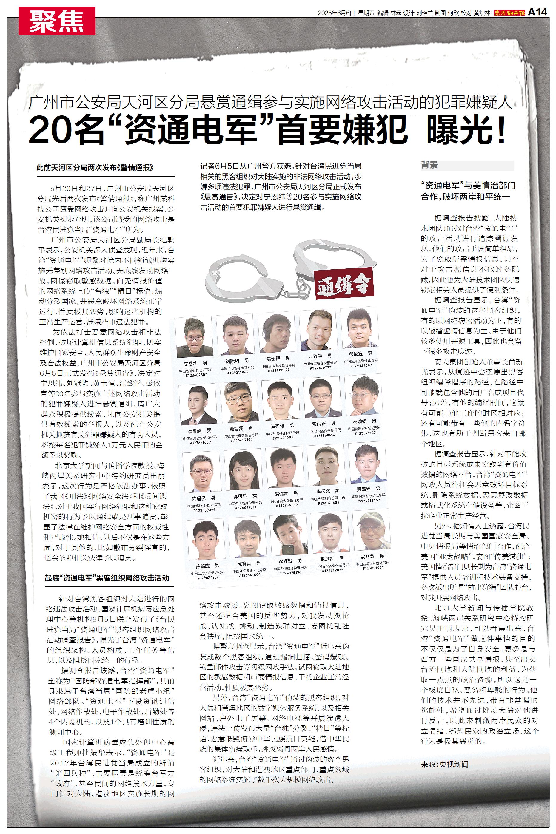 记者6月5日从广州警方获悉,针对台湾民进党当局相关的黑客组织对大陆实施的非法网络攻击活动,涉嫌多项违法犯罪,广州市公安局天河区分局正式发布《悬赏通告》,决定对宁恩纬等20名参与实施网络攻击活动的首要犯