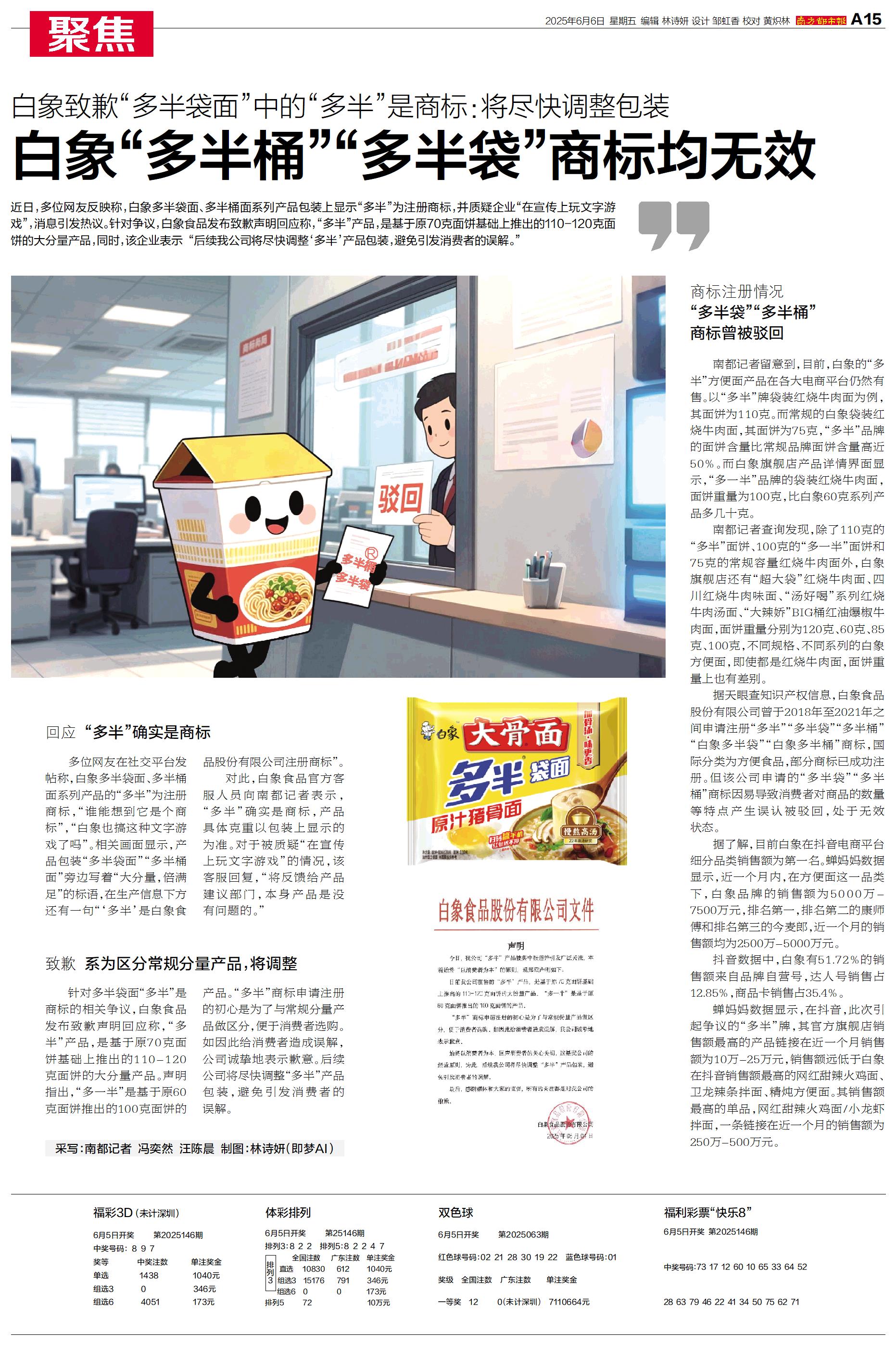 近日,多位网友反映称,白象多半袋面、多半桶面系列产品包装上显示“多半”为注册商标,并质疑企业“在宣传上玩文字游戏”,消息引发热议。
