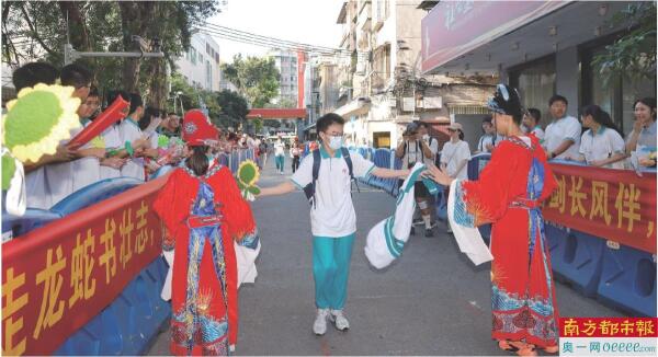 6月7日早上8时许,考生陆续走入广州六中考点,入场通道两侧,六中本校学生举着拍手器,纷纷向入场考生喊起加油,更有“财神爷”人偶在通道举起“旗开得胜”条幅,为考生们讨个好彩头。送考教师也来到现场,穿着特别定制的红色送考服,期盼着自家学生的入场。
