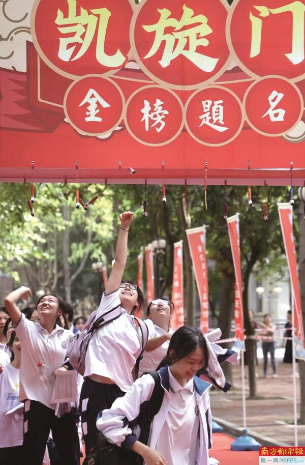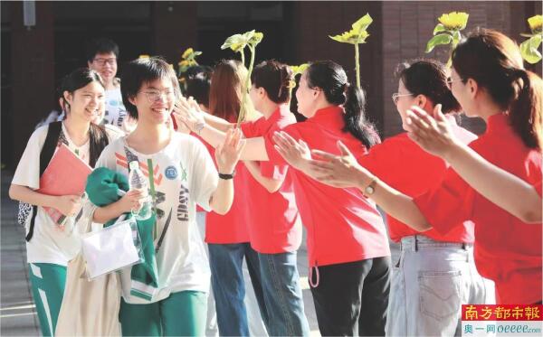 广州天省实验学校,老师们高举向日葵和考生击掌。