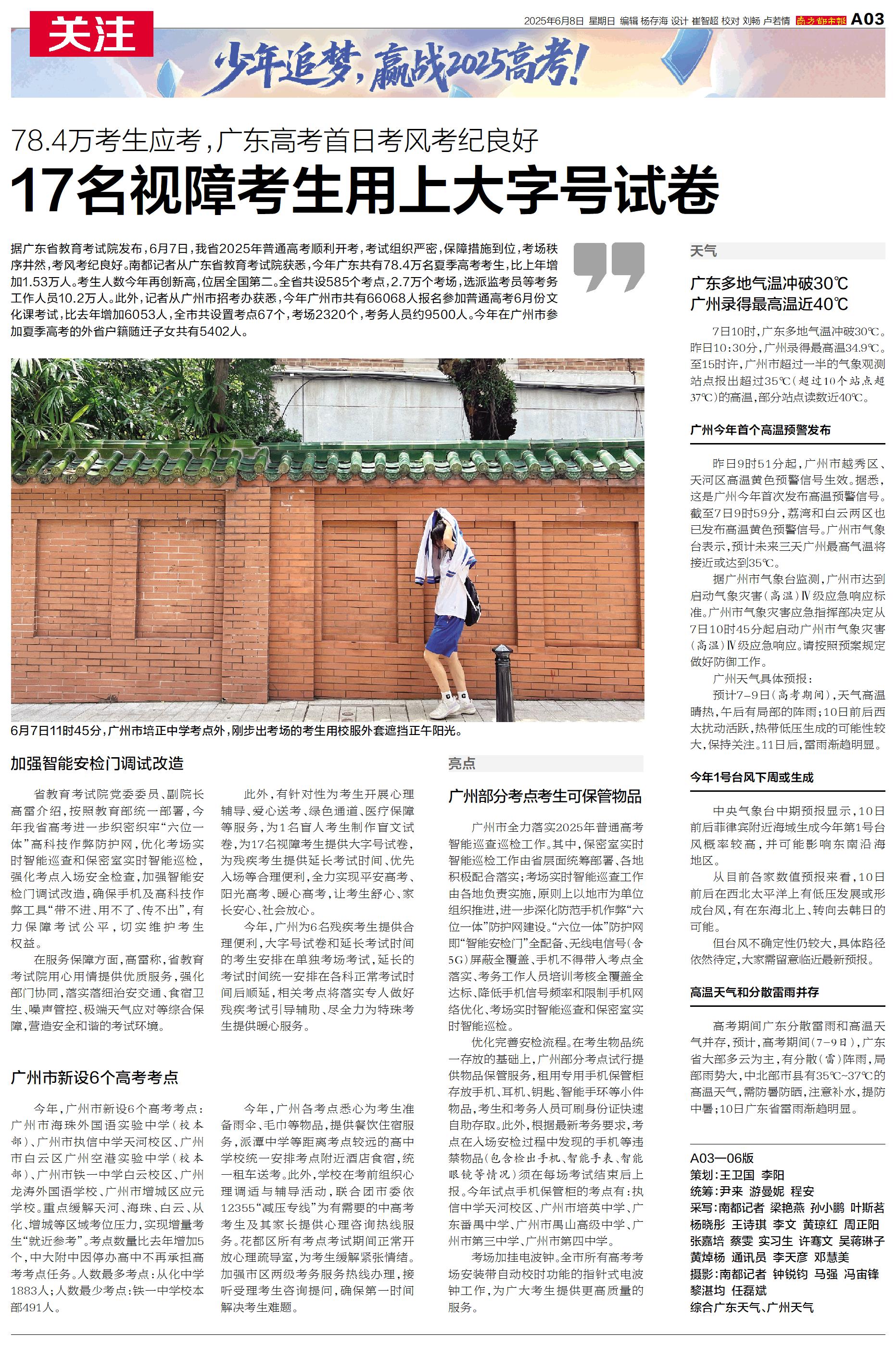 据广东省教育考试院发布,6月7日,我省2025年普通高考顺利开考,考试组织严密,保障措施到位,考场秩序井然,考风考纪良好。