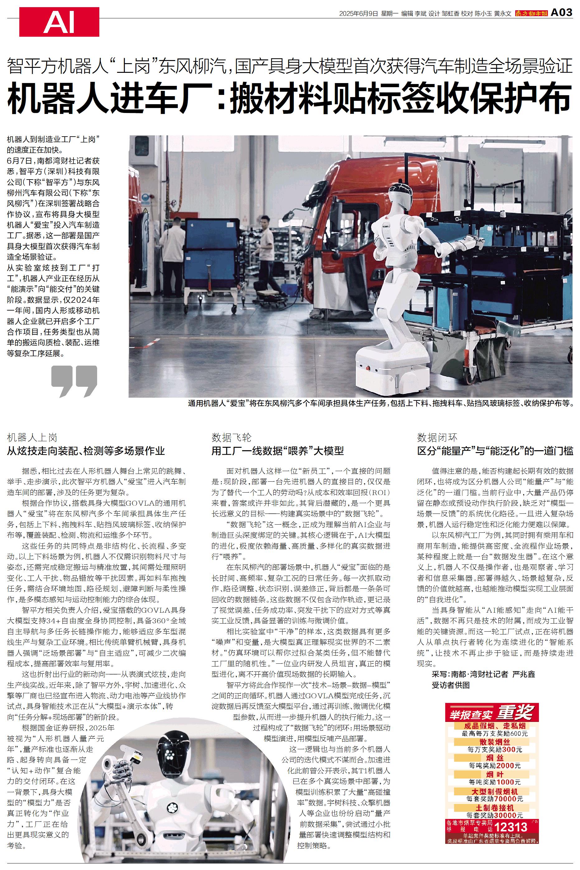 6月7日,南都湾财社记者获悉,智平方(深圳)科技有限公司(下称“智平方”)与东风柳州汽车有限公司(下称“东风柳汽”)在深圳签署战略合作协议,宣布将具身大模型机器人“爱宝”投入汽车制造工厂。