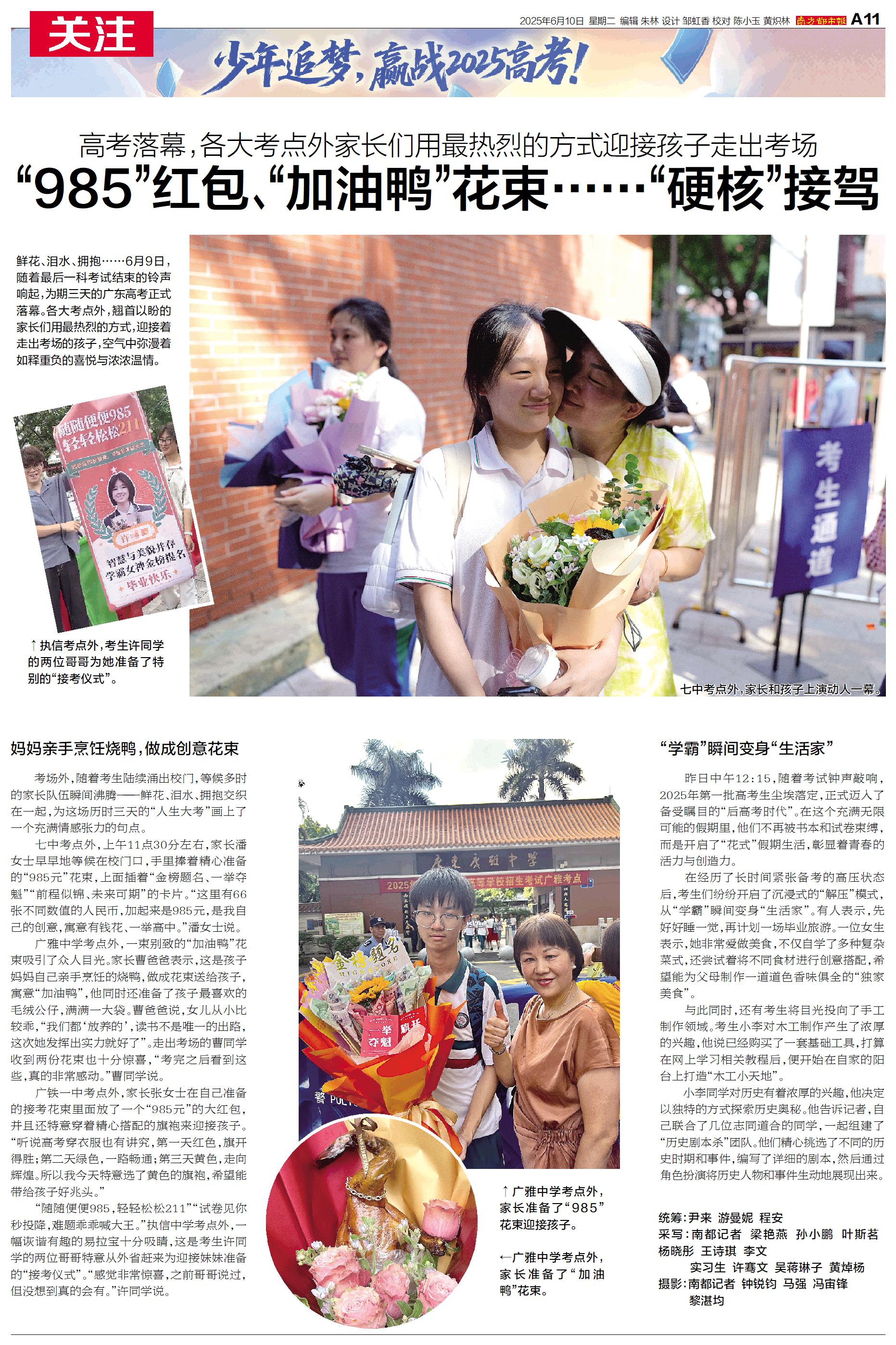 广雅中学考点外,家长准备了“985”花束迎接孩子。