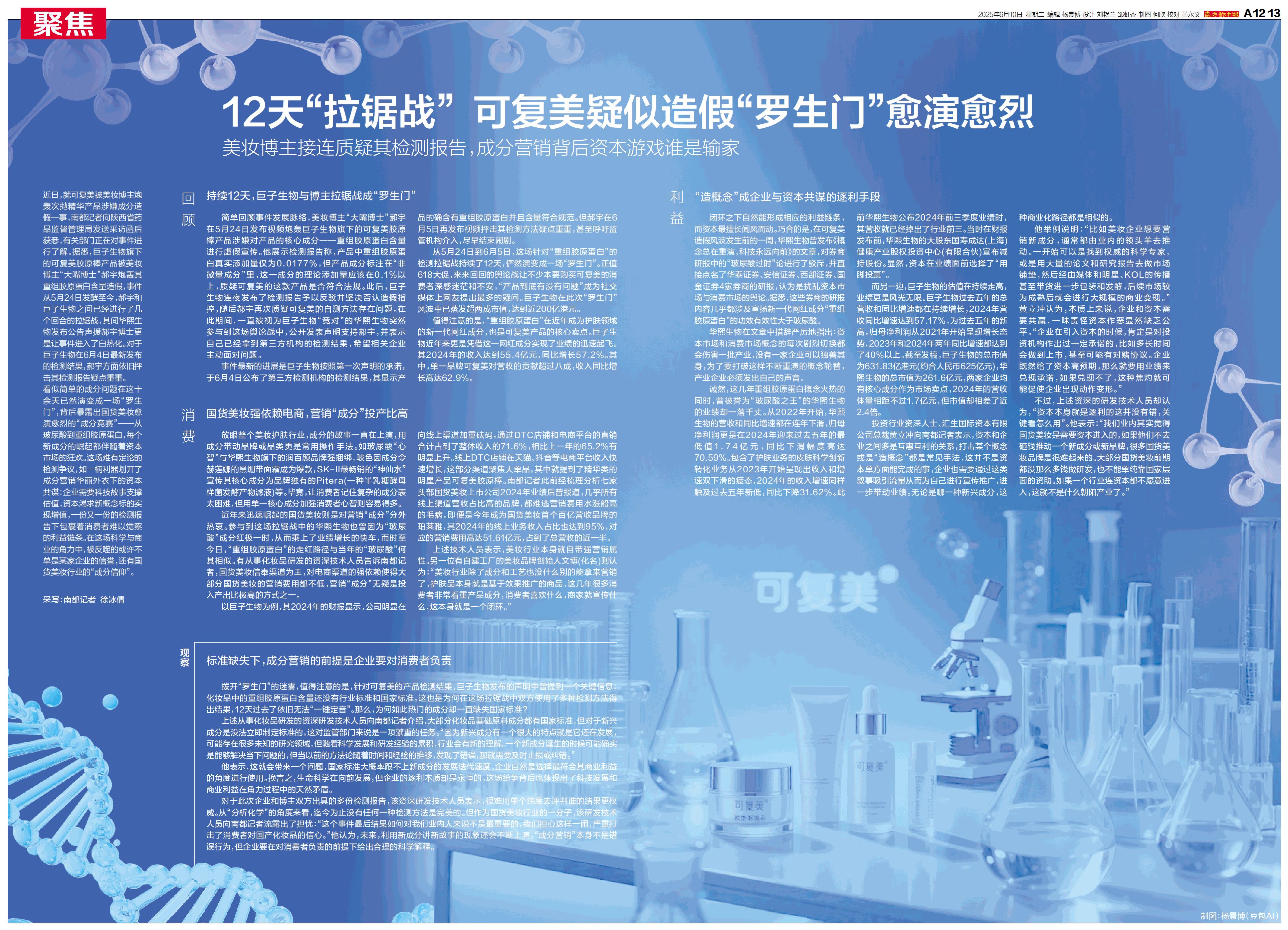 看似简单的成分问题在这十余天已然演变成一场“罗生门”,背后暴露出国货美妆愈演愈烈的“成分竞赛”——从玻尿酸到重组胶原蛋白,每个新成分的崛起都伴随着资本市场的狂欢。这场难有定论的检测争议,如一柄利器划开了成分营销华丽外衣下的资本共谋:企业需要科技故事支撑估值,资本渴求新概念标的实现增值,一份又一份的检测报告下包裹着消费者难以觉察的利益链条。在这场科学与商业的角力中,被反噬的或许不单是某家企业的信誉,还有国货美妆行业的“成分信仰”。