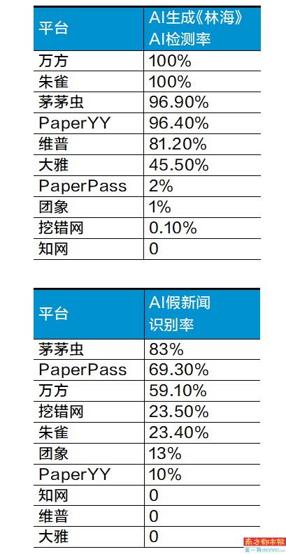 对于AI生成的散文《林海》,万方、朱雀准确识别出了AI生成内容(判定率100%),茅茅虫、PaperYY的判定率也都超过了95%,而知网、挖错网、团象、PaperPass却出现漏检,AI率检测结果分别仅为0%、0.1%、1%、2%。针对含20%AI内容的某假新闻,茅茅虫、PaperPass、万方的AI识别率过高,知网、维普、大雅的AI识别率则偏低。