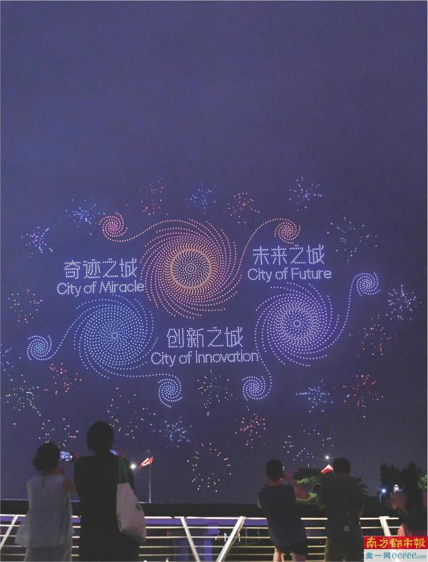 2024年9月26日晚,深圳无人机国庆启幕大秀在深圳湾公园上空举行,10197架无人机带来一场视觉盛宴。 新华社发