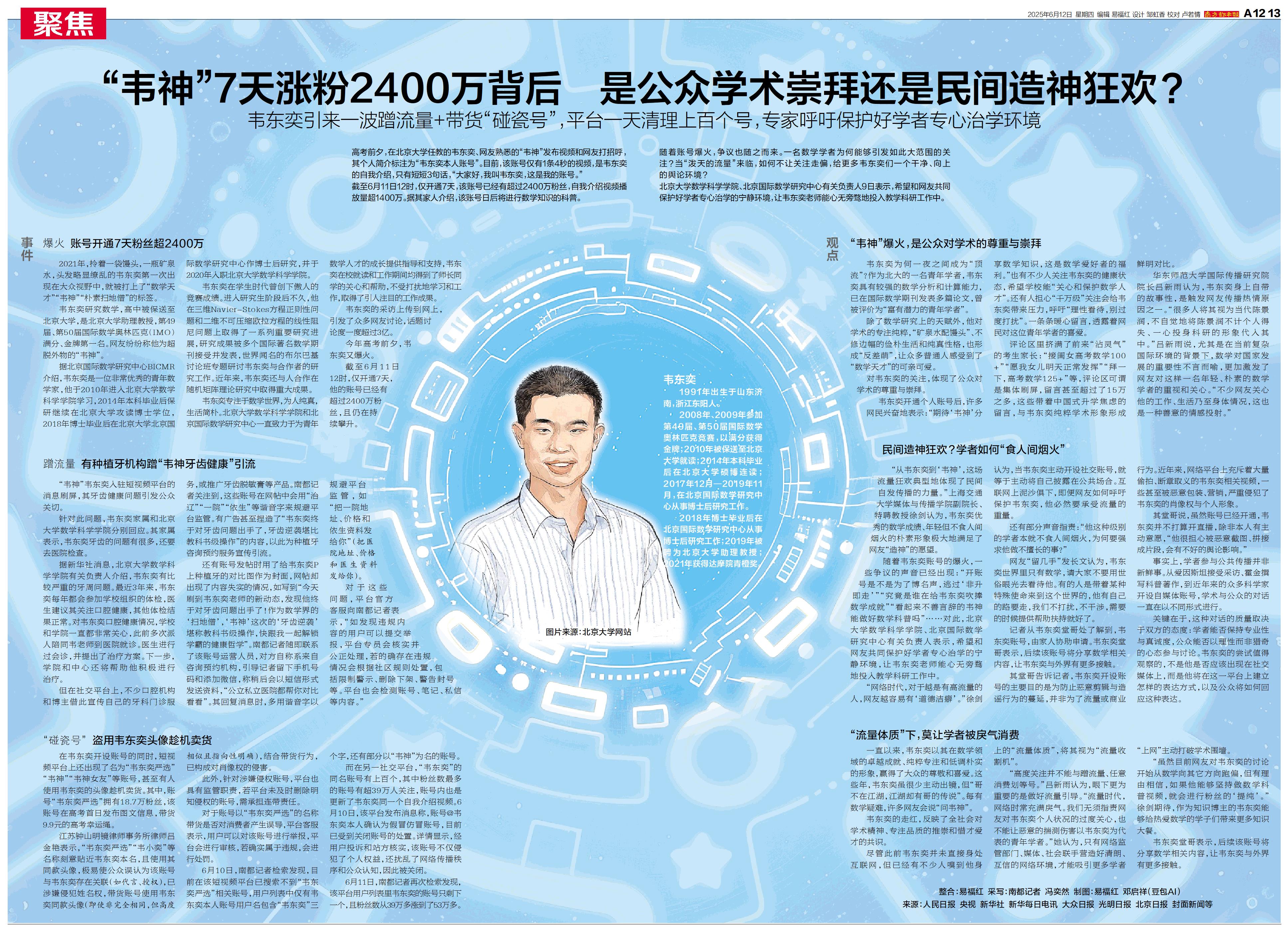 随着账号爆火,争议也随之而来。一名数学学者为何能够引发如此大范围的关注?当“泼天的流量”来临,如何不让关注走偏,给更多韦东奕们一个干净、向上的舆论环境?