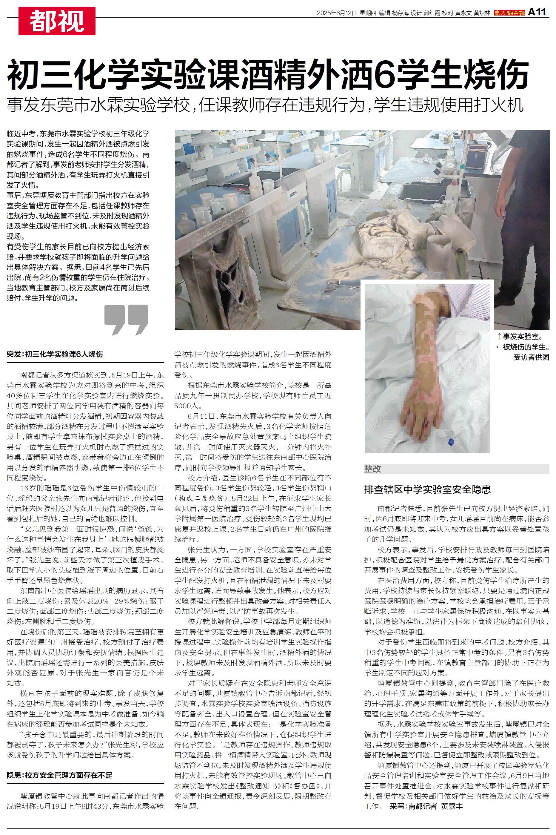 临近中考,东莞市水霖实验学校初三年级化学实验课期间,发生一起因酒精外洒被点燃引发的燃烧事件,造成6名学生不同程度烧伤。