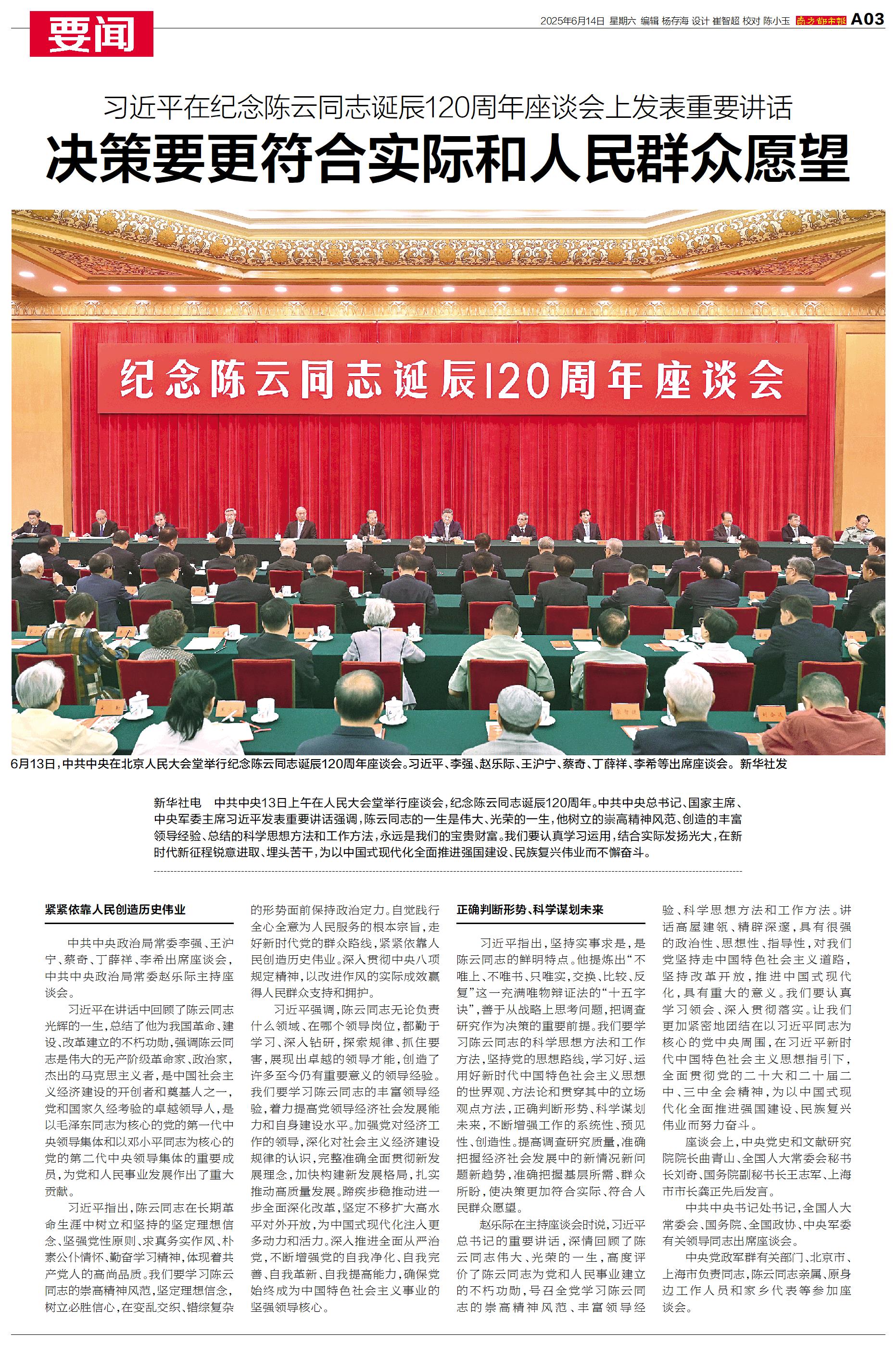 中共中央13日上午在人民大会堂举行座谈会,纪念陈云同志诞辰120周年。