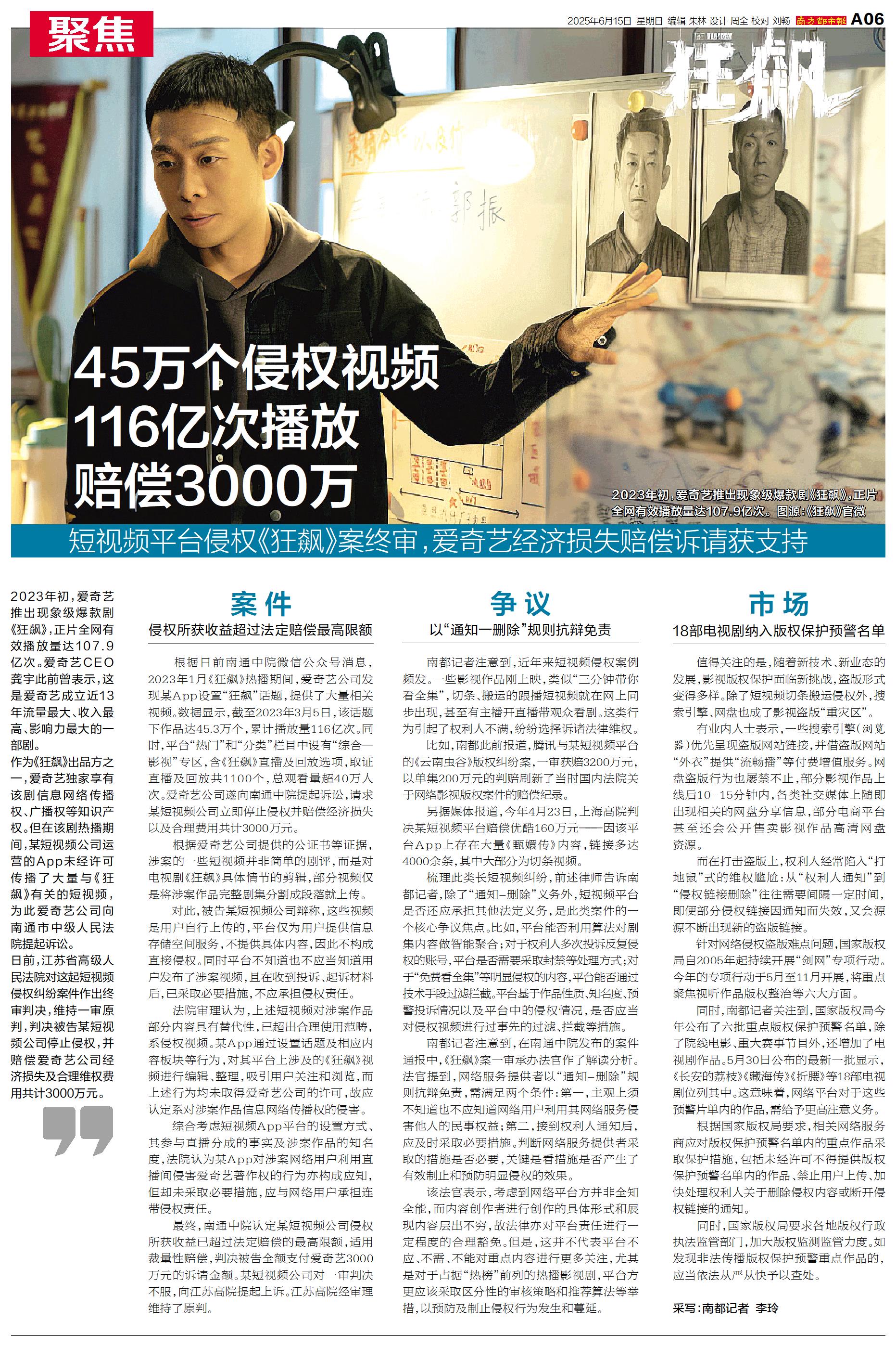 日前,江苏省高级人民法院对这起短视频侵权纠纷案件作出终审判决,维持一审原判,判决被告某短视频公司停止侵权,并赔偿爱奇艺公司经济损失及合理维权费用共计3000万元。