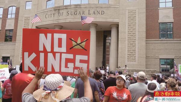 在美国得克萨斯州休斯敦,人们参加“不要国王”抗议活动。
