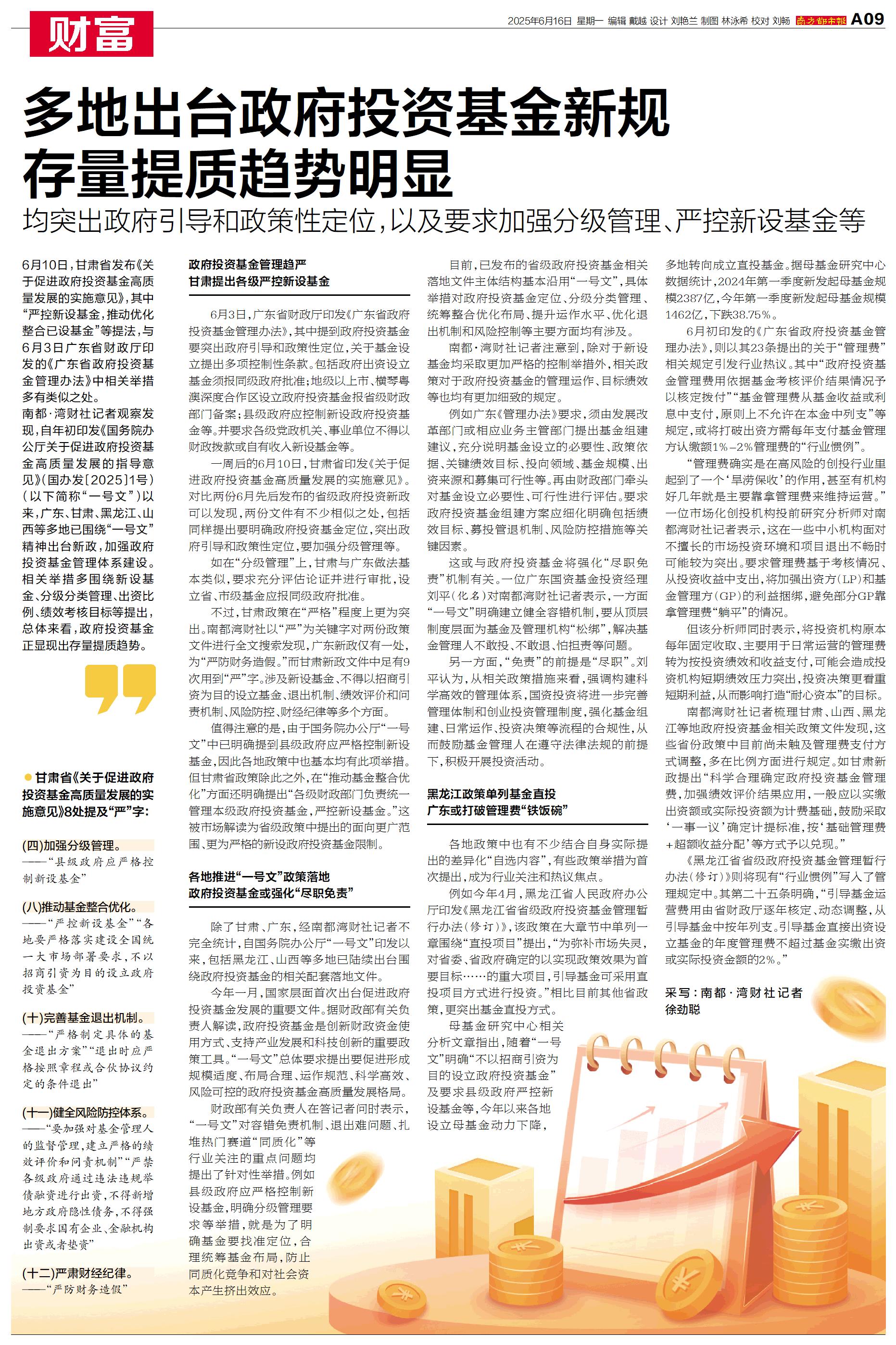 6月10日,甘肃省发布《关于促进政府投资基金高质量发展的实施意见》,其中“严控新设基金,推动优化整合已设基金”等提法,与6月3日广东省财政厅印发的《广东省政府投资基金管理办法》中相关举措多有类似之处。