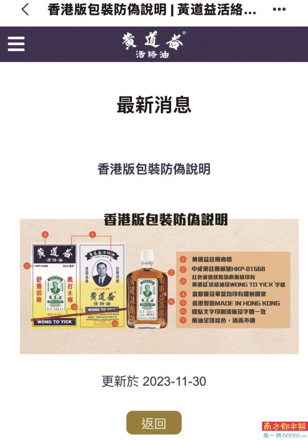 黄道益活络油有限公司就此向南都记者说明,黄道益活络油仅在香港生产制造,并无其他产地。黄道益活络油有限公司仅授权和许可“香港黄氏医药控股有限公司”及“黄氏国际药业有限公司”使用本公司的黄道益商标,从未授权或许可任何其他企业在活络油上使用。