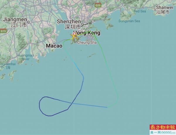 ADS-B信号显示AI315航班从香港起飞后,在海面调整航向,随后折返香港机场。 网络图片