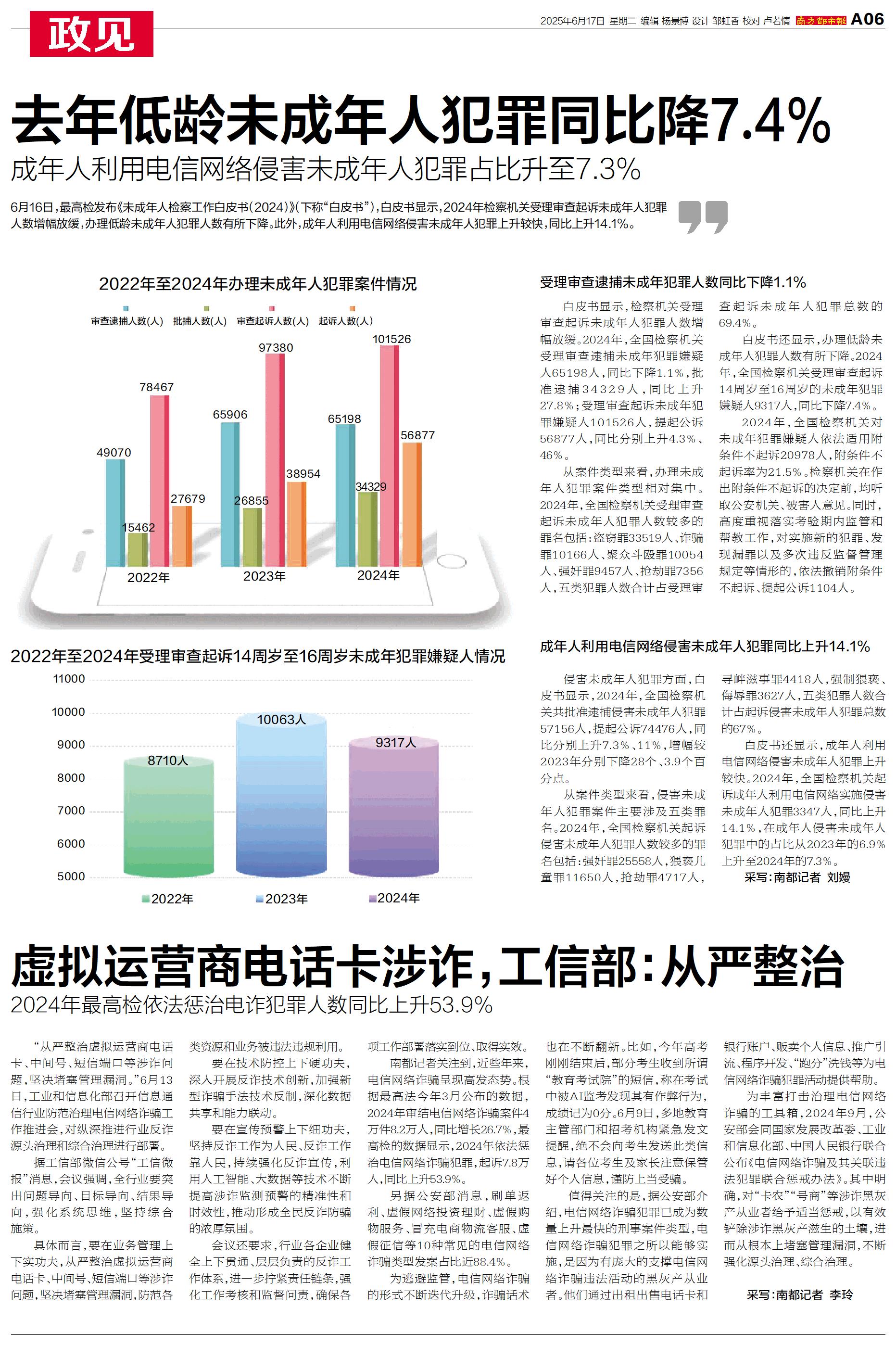 6月16日,最高检发布《未成年人检察工作白皮书(2024)》,白皮书显示,2024年检察机关受理审查起诉未成年人犯罪人数增幅放缓,办理低龄未成年人犯罪人数有所下降。