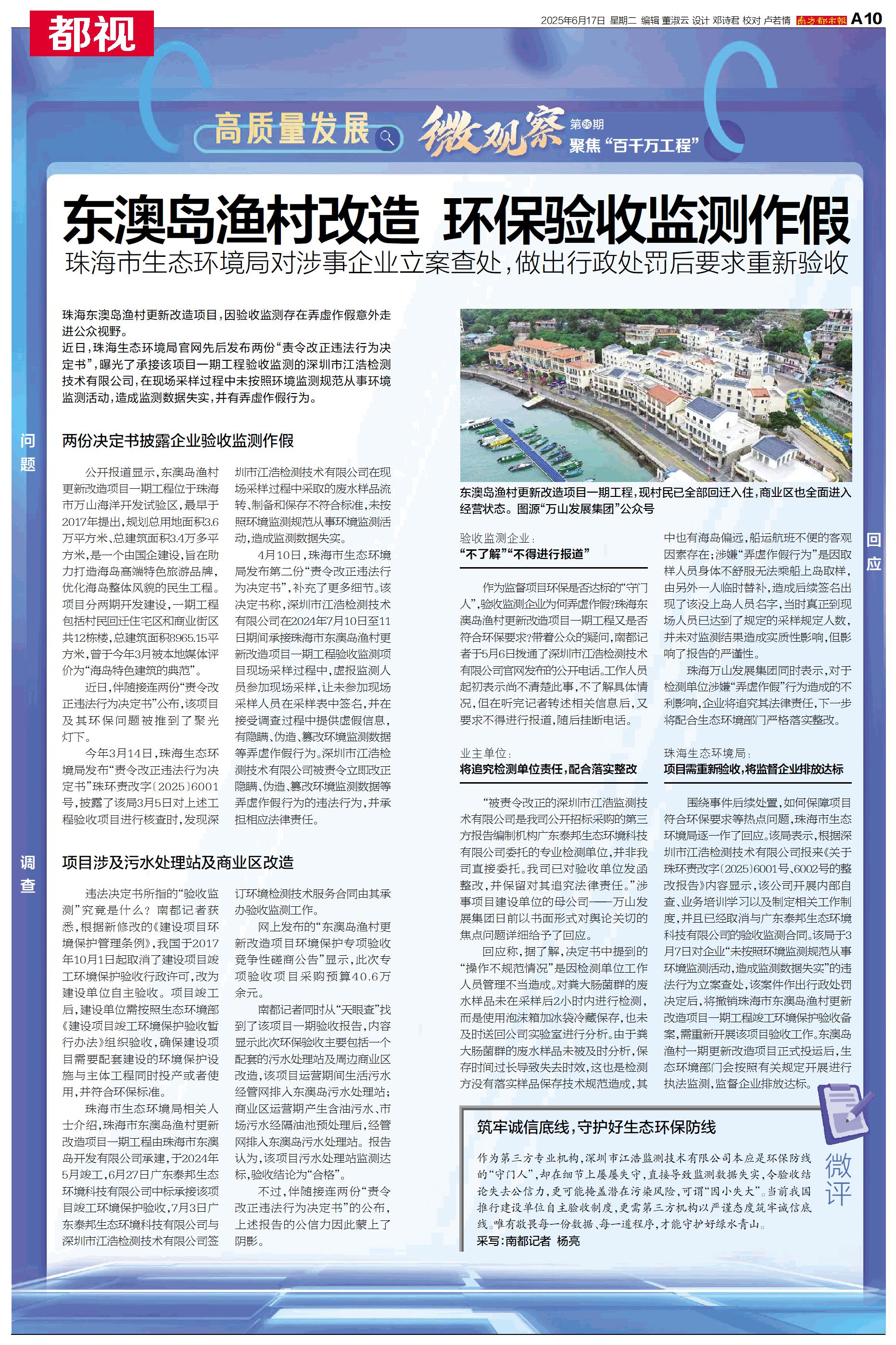 珠海东澳岛渔村更新改造项目,因验收监测存在弄虚作假意外走进公众视野。