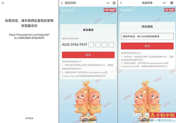 左、中分别为使用微信、支付宝扫描假冒泡泡玛特防伪二维码后出现的界面,右为正版泡泡玛特防伪小程序。