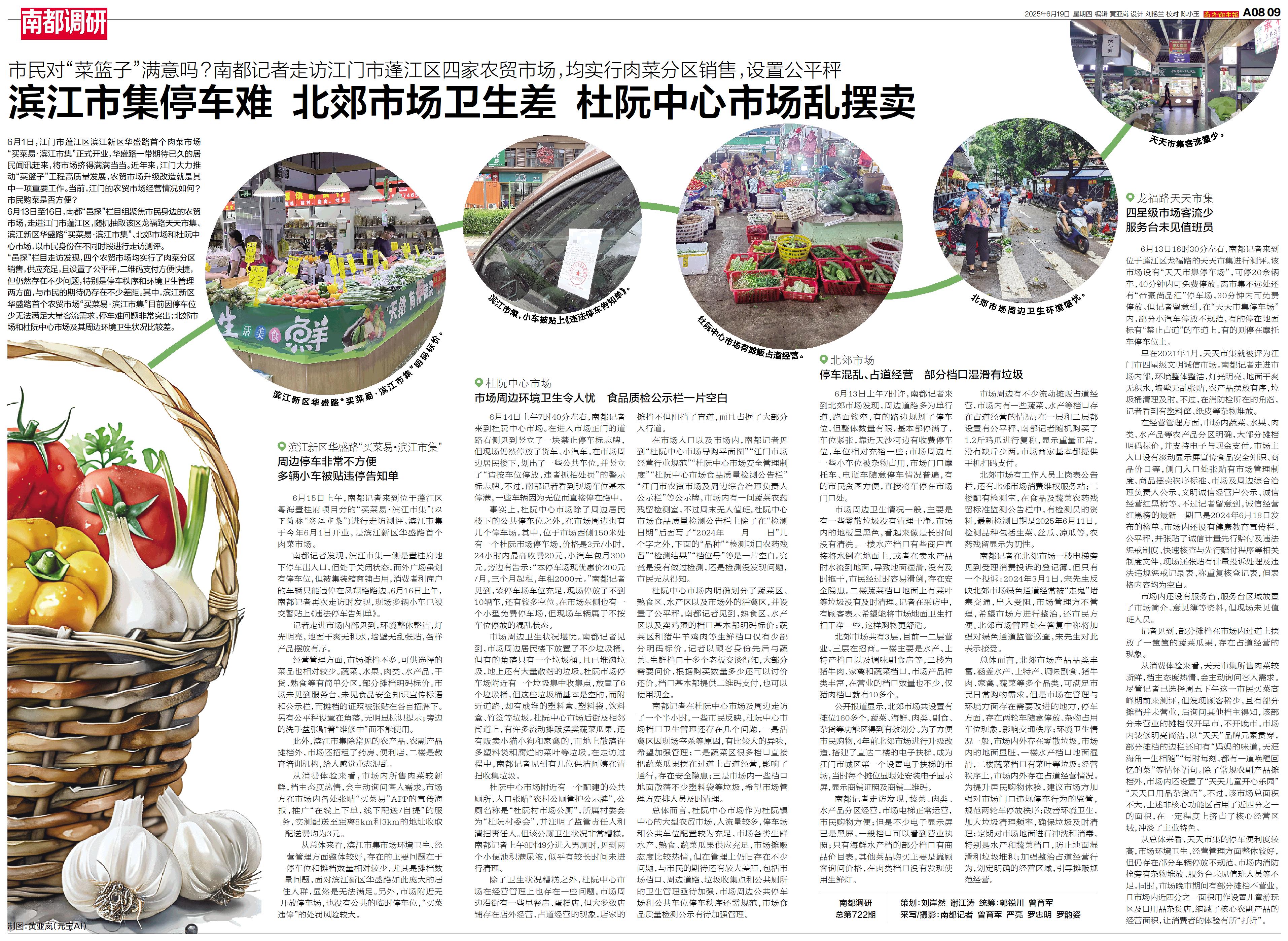 6月13日至16日,南都“邑探”栏目组聚焦市民身边的农贸市场,走进江门市蓬江区,随机抽取该区龙福路天天市集、滨江新区华盛路“买菜易·滨江市集”、北郊市场和杜阮中心市场,以市民身份在不同时段进行走访测评。