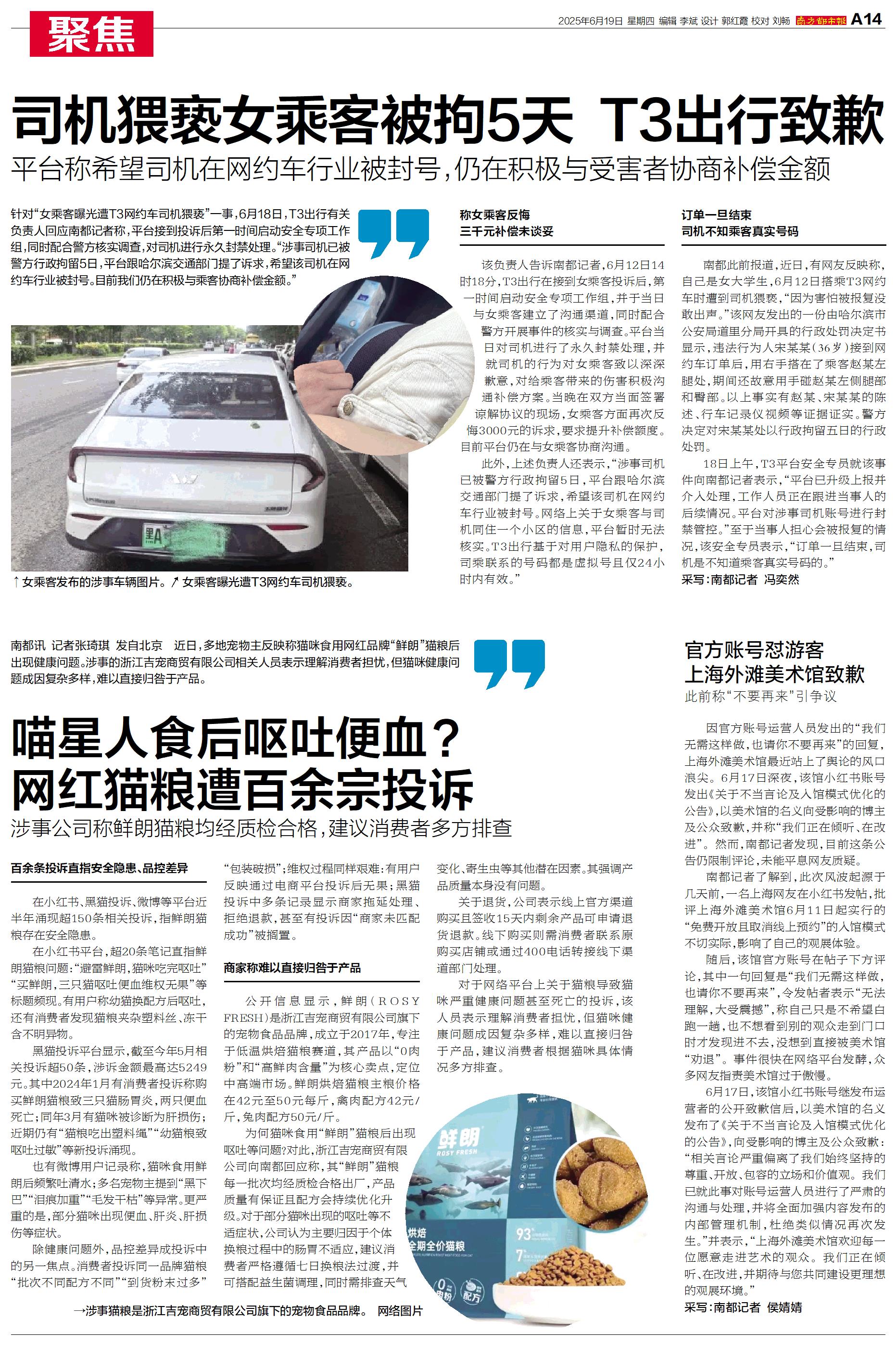 针对“女乘客曝光遭T3网约车司机猥亵”一事,6月18日,T3出行有关负责人回应南都记者称,平台接到投诉后第一时间启动安全专项工作组,同时配合警方核实调查,对司机进行永久封禁处理。“涉事司机已被警方行政拘留5日,平台跟哈尔滨交通部门提了诉求,希望该司机在网约车行业被封号。目前我们仍在积极与乘客协商补偿金额。”