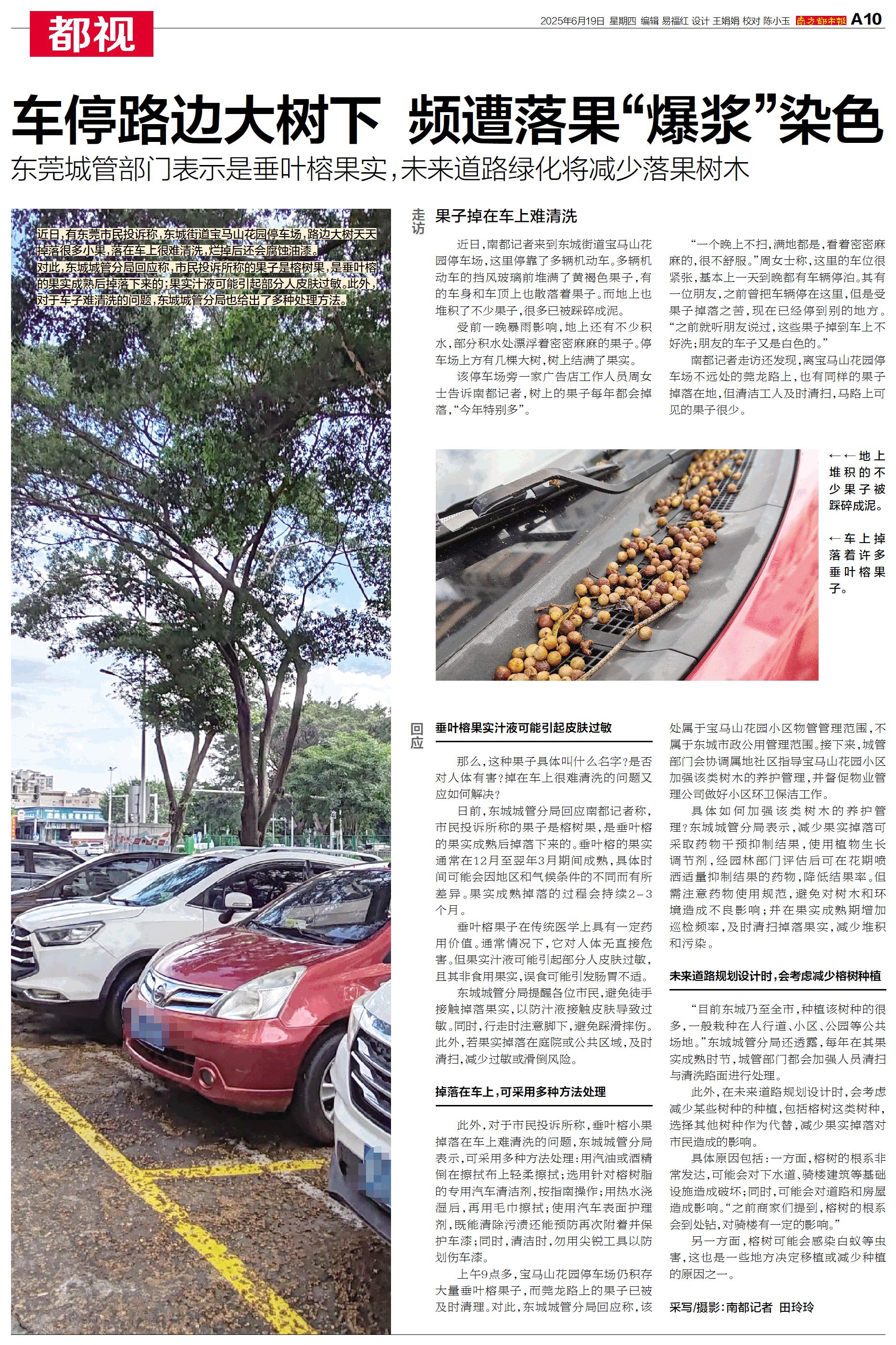 近日,有东莞市民投诉称,东城街道宝马山花园停车场,路边大树天天掉落很多小果,落在车上很难清洗,烂掉后还会腐蚀油漆。