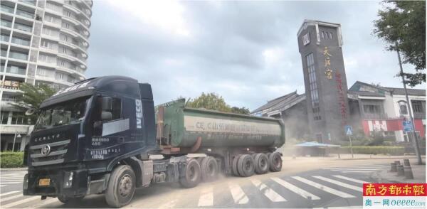 大型运沙车频繁穿梭,泥巴撒落路面泥泞不堪