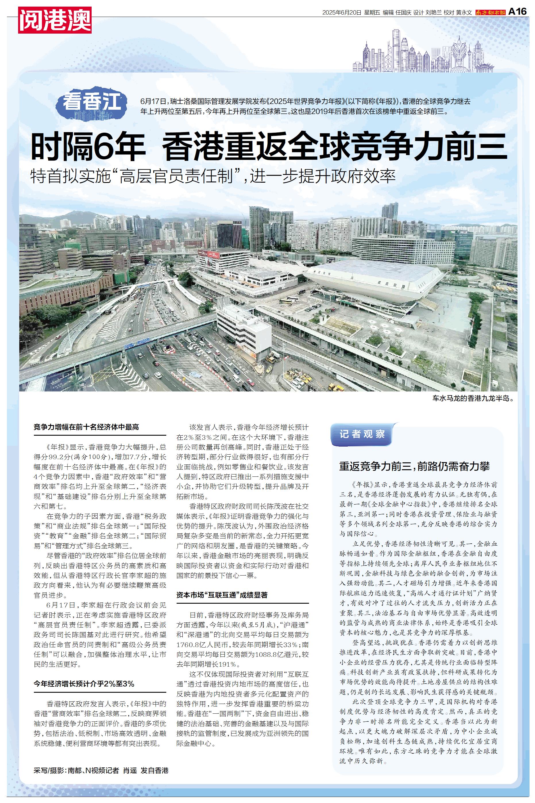 6月17日,瑞士洛桑国际管理发展学院发布《2025年世界竞争力年报》(以下简称《年报》),香港的全球竞争力继去年上升两位至第五后,今年再上升两位至全球第三。