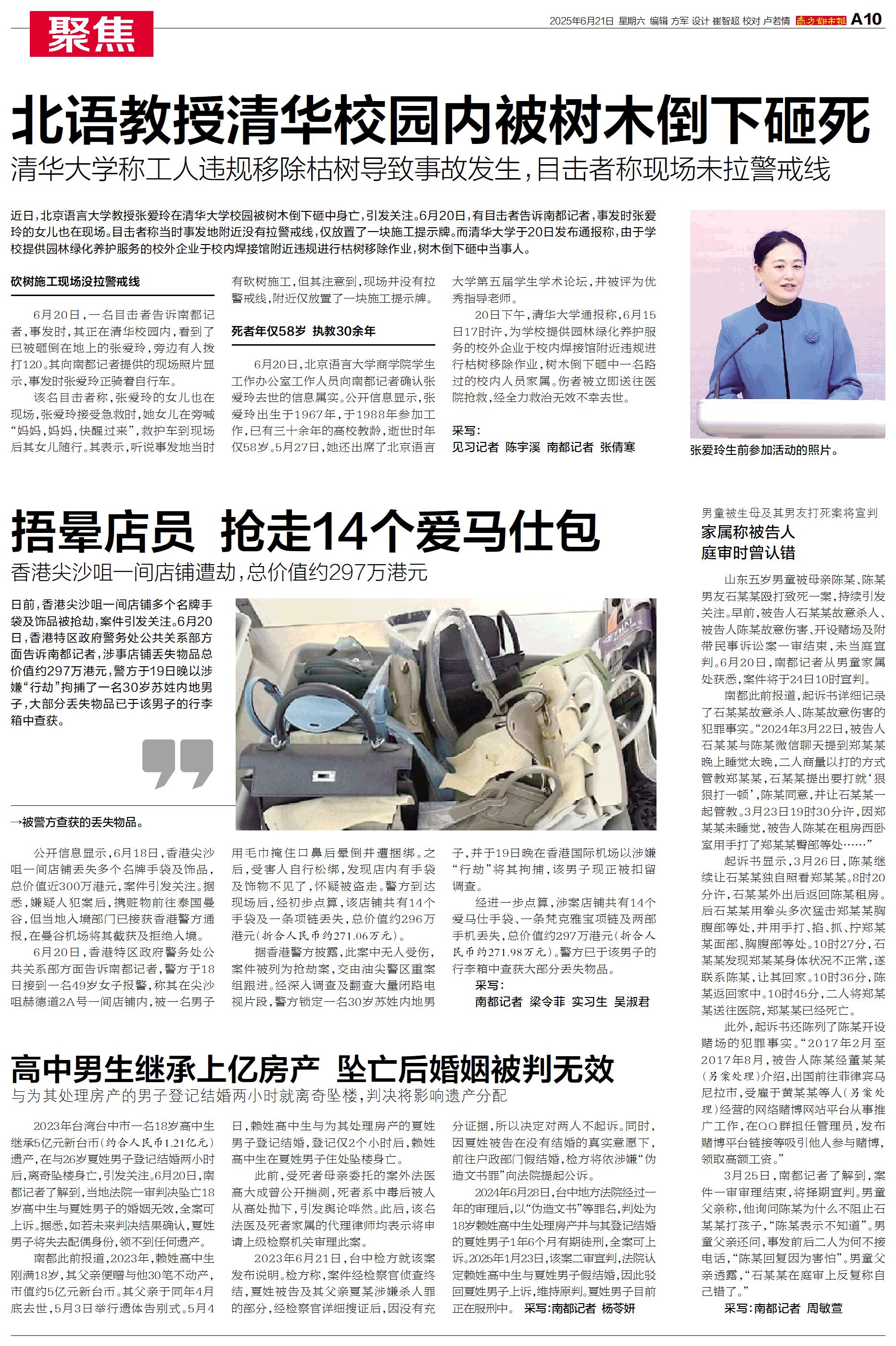 近日,北京语言大学教授张爱玲在清华大学校园被树木倒下砸中身亡,引发关注。