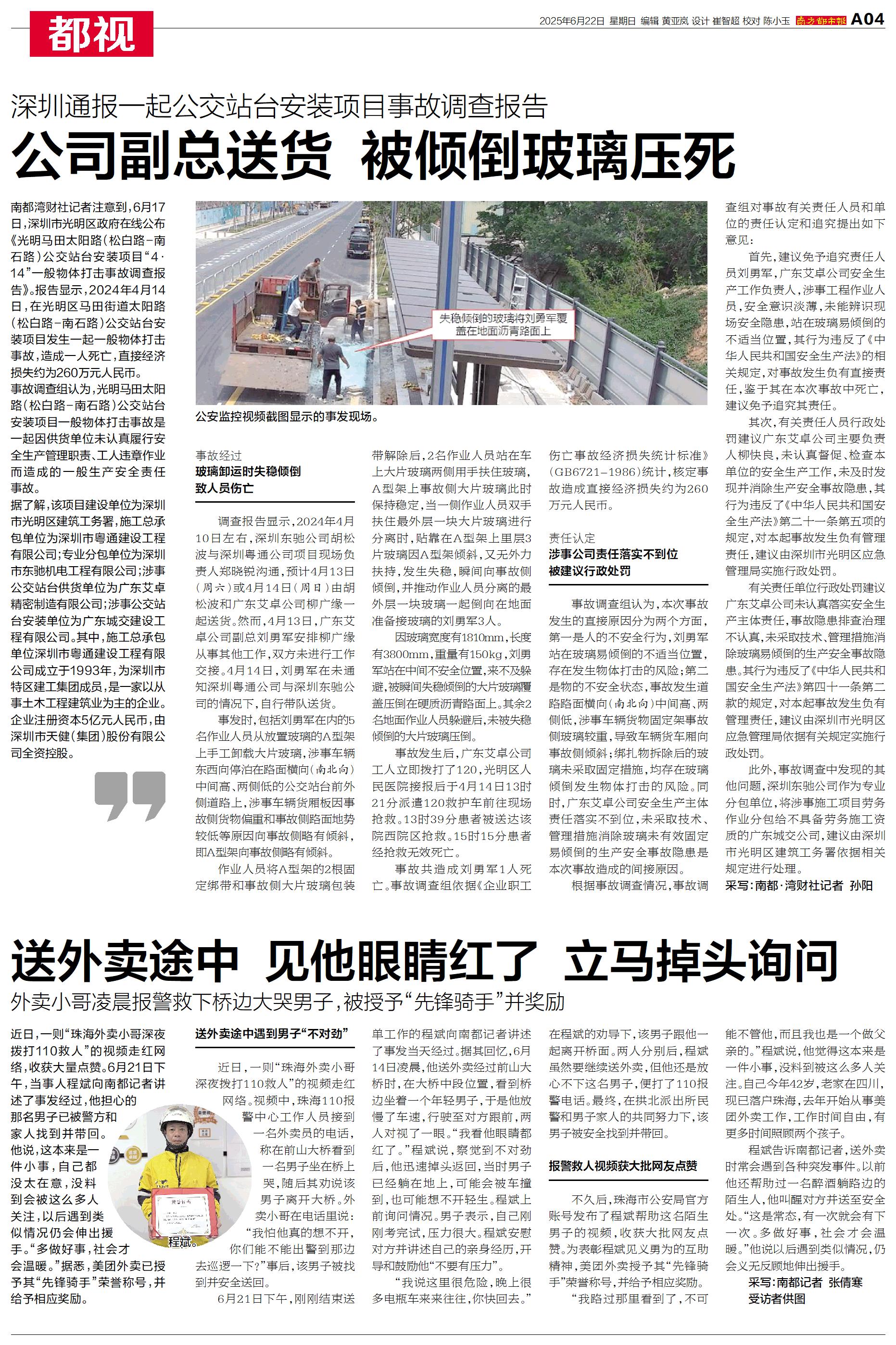 南都湾财社记者注意到,6月17日,深圳市光明区政府在线公布《光明马田太阳路(松白路-南石路)公交站台安装项目“4·14”一般物体打击事故调查报告》。