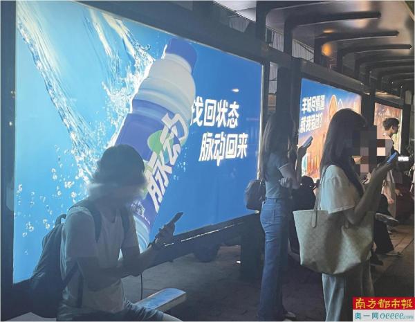 记者观察到,凸起的脉动饮料是斜着粘在广告牌上,因此其下方座椅只能坐下1-2人。