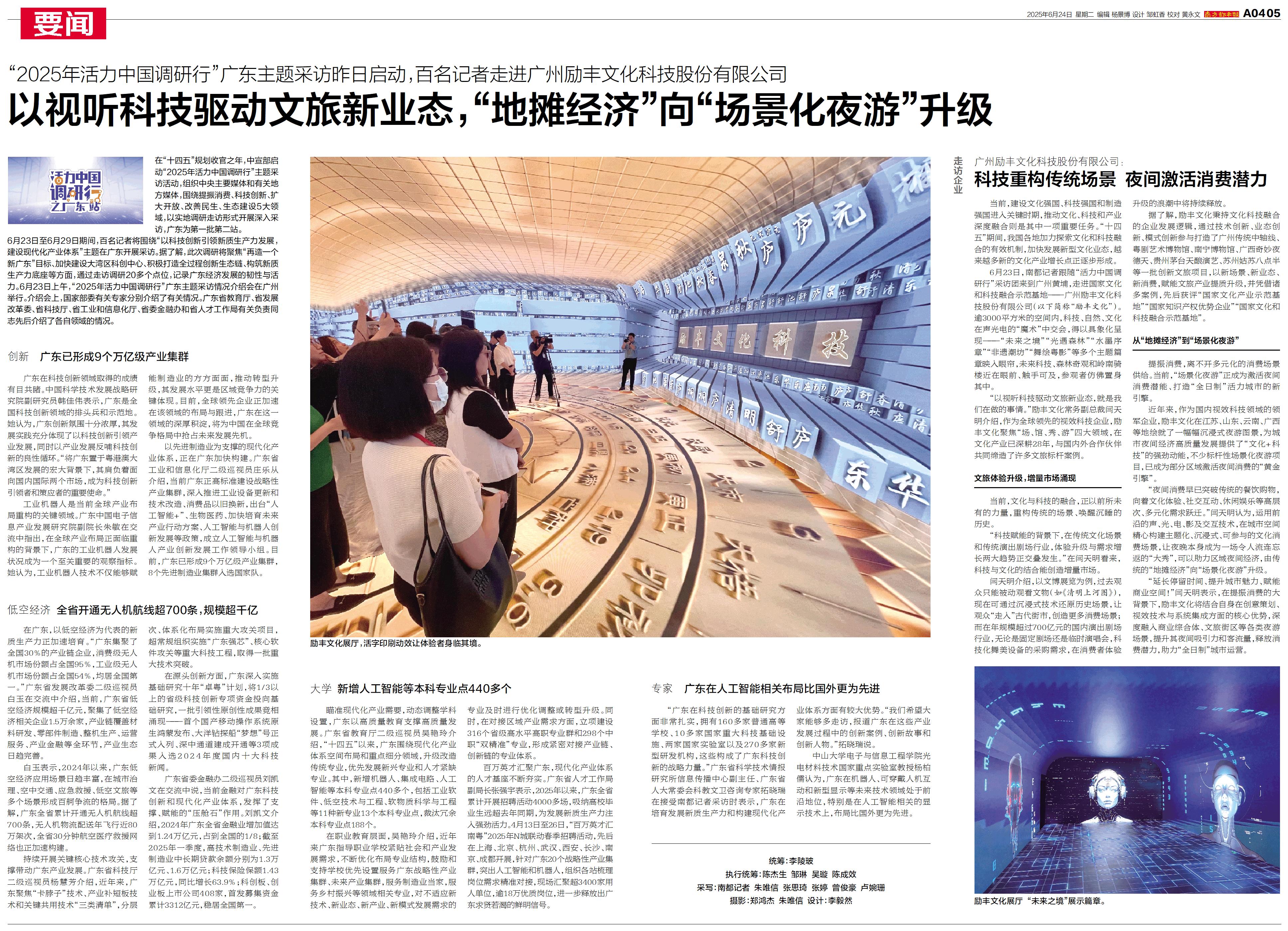 6月23日至6月29日期间,百名记者将围绕“以科技创新引领新质生产力发展,建设现代化产业体系”主题在广东开展采访。据了解,此次调研将聚焦“再造一个新广东”目标、加快建设大湾区科创中心、积极打造全过程创新生态链、构筑新质生产力底座等方面,通过走访调研20多个点位,记录广东经济发展的韧性与活力。6月23日上午,“2025年活力中国调研行”广东主题采访情况介绍会在广州举行。介绍会上,国家部委有关专家分别介绍了有关情况。广东省教育厅、省发展改革委、省科技厅、省工业和信息化厅、省委金融办和省人才工作局有关负责同志先后介绍了各自领域的情况。